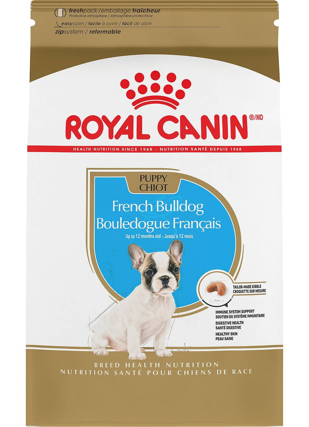 Serve up the tailored nutrition your French Bulldog deserves with Royal Canin Breed Health Nutrition French Bulldog Puppy Dog Food Dry Formula. Royal Canin makes it easier than ever to feed your puppy tailored dog food. This French Bulldog food features a customized curved-shaped kibble that is specially designed for your French Bulldog's short muzzle and jaw shape, making it easy for little dogs to pick up and chew. Not only that, but this complete and balanced puppy food provides the nutrition to help your best friend thrive. An exclusive mix of antioxidants and vitamin E in the dog kibble promotes healthy development of your puppy's immune system, while exclusive nutrients help support the skin barrier for healthy skin. Royal Canin French Bulldog food is formulated with high-quality protein and prebiotics to support digestive health and a balanced intestinal flora, contributing to optimal stool quality. Size: 11.42 lb