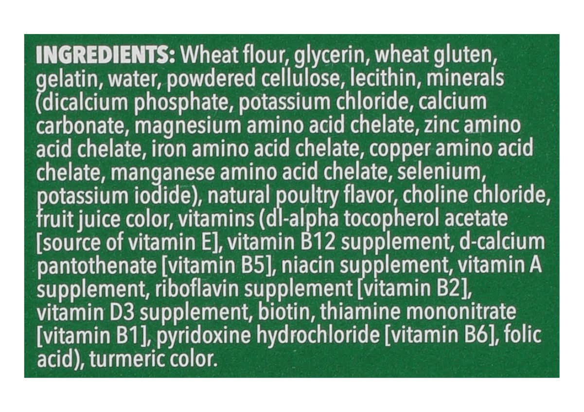 Ingredients: Wheat Flour, Glycerin, Wheat Gluten, Gelatin, Water, Powdered Cellulose, Lecithin, Minerals (Dicalcium Phosphate Potassium Chloride Calcium Carbonate Magnesium Amino Acid Chelate Zinc Amino Acid Chelate Iron Amino Acid Chelate Copper Amino Acid Chelate Manganese Amino Acid Chelate Selenium Potassium Iodide), Natural Poultry Flavor, Choline Chloride, Fruit Juice Color, Vitamins (DL-Alpha Tocopherol Acetate [Source of Vitamin E] Vitamin B12 Supplement D-Calcium Pantothenate [Vitamin B5] Niacin Supplement Vitamin A Supplement Riboflavin Supplement [Vitamin B2] Vitamin D3 Supplement Biotin Thiamine Mononitrate [Vitamin B1] Pyridoxine Hydrochloride [Vitamin B6] Folic Acid), Turmeric Color Contains: Wheat, Gluten