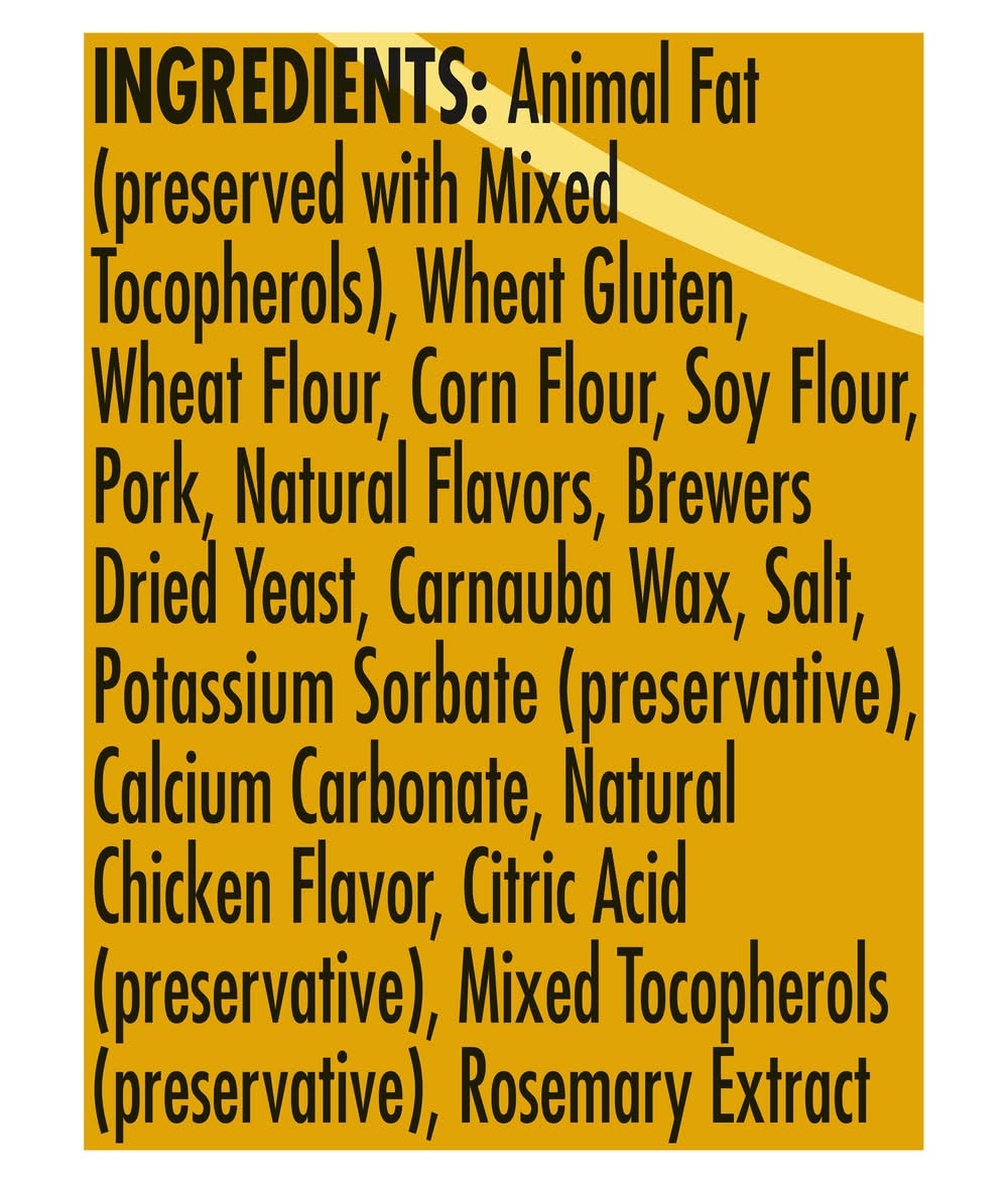 Ingredients: Animal Fat (Preserved with Mixed Tocopherols), Wheat Gluten, Wheat Flour, Corn Flour, Soy Flour, Pork, Natural Flavors, Brewers Dried Yeast, Carnauba Wax, Salt, Potassium Sorbate (Preservative), Calcium Carbonate, Natural Chicken Flavor, Citric Acid (Preservative), Mixed Tocopherols (Preservative), Rosemary Extract Contains: Wheat, Gluten, Corn, Soybeans
