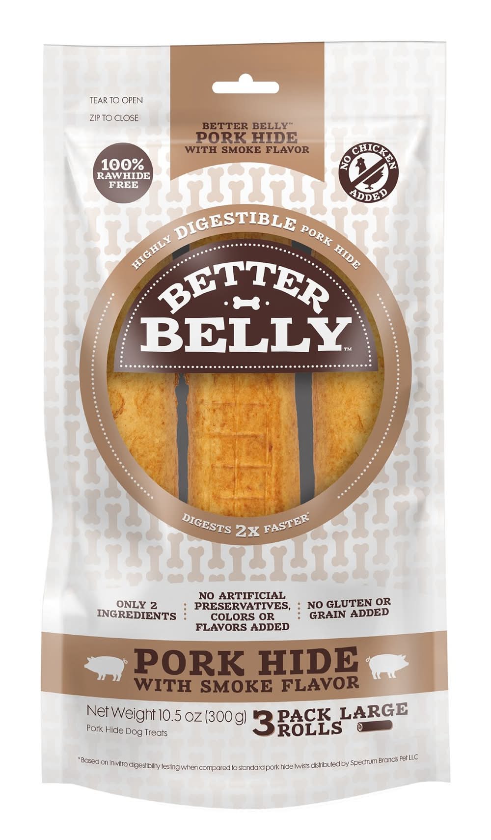 Better Belly All Life Stages Highly Digestible Large Pork Hide Rolls Dog Chew - Smoked Pork 10.5 oz (Flavor: Pork, Size: 3 Count)