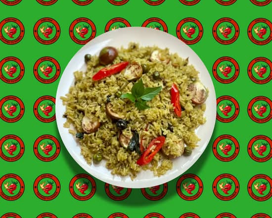 Khao Pad Gang Kiew Wan / Green Curry Fried Rice is rich green curry paste stir-fried with rice, egg, bamboo shoot, onions, green onion, pea, carrot, and your choice of protein in House savory brown sauce.