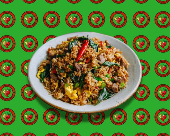 KHAO PAD KRAPOW: Also known as basil fried rice is a Uniquely Thai dish, fried rice stir-fried with Thai holy basil, egg, onions, green onion, pea, carrot, bell pepper, your choice of protein, stir-fried in House savory Brown Sauce