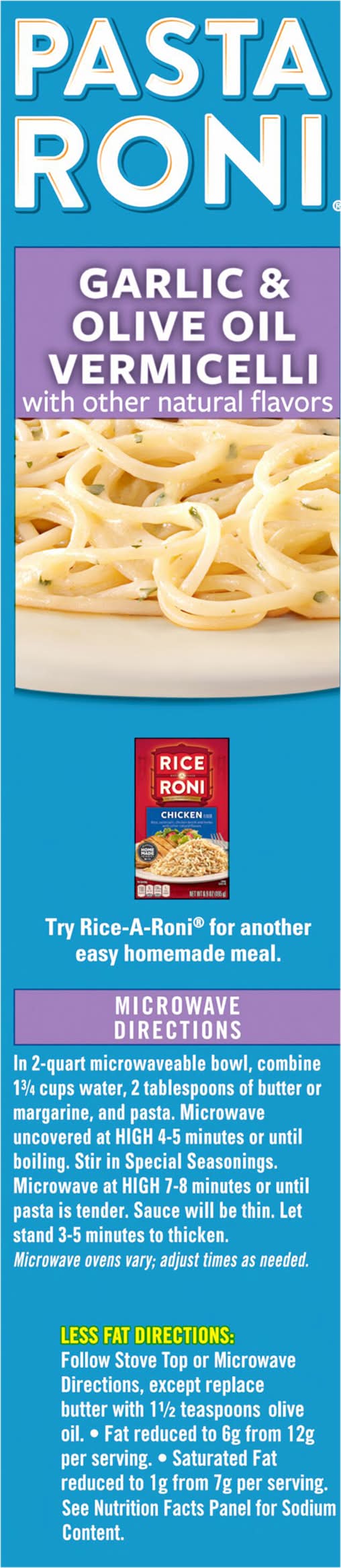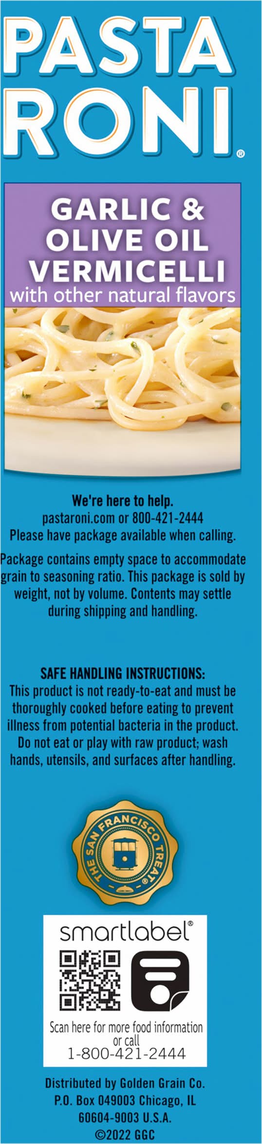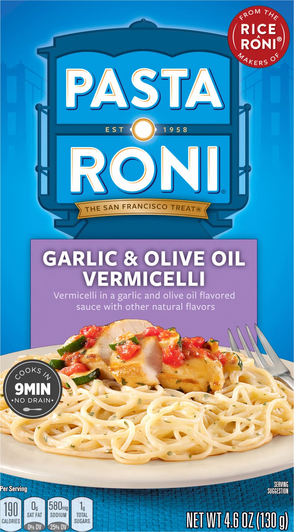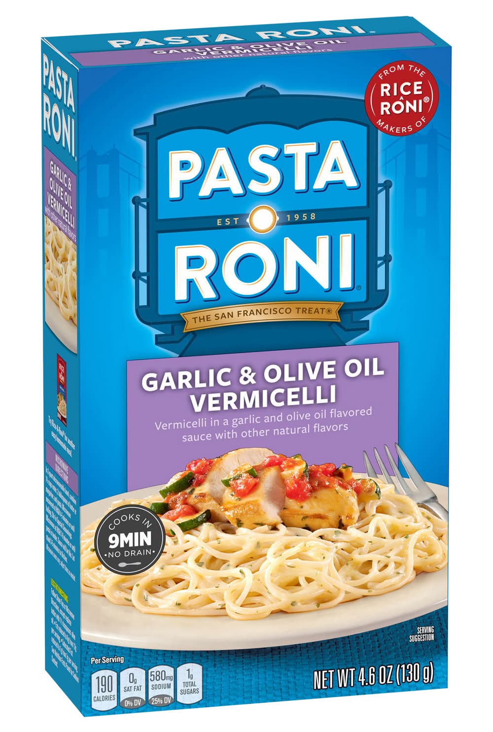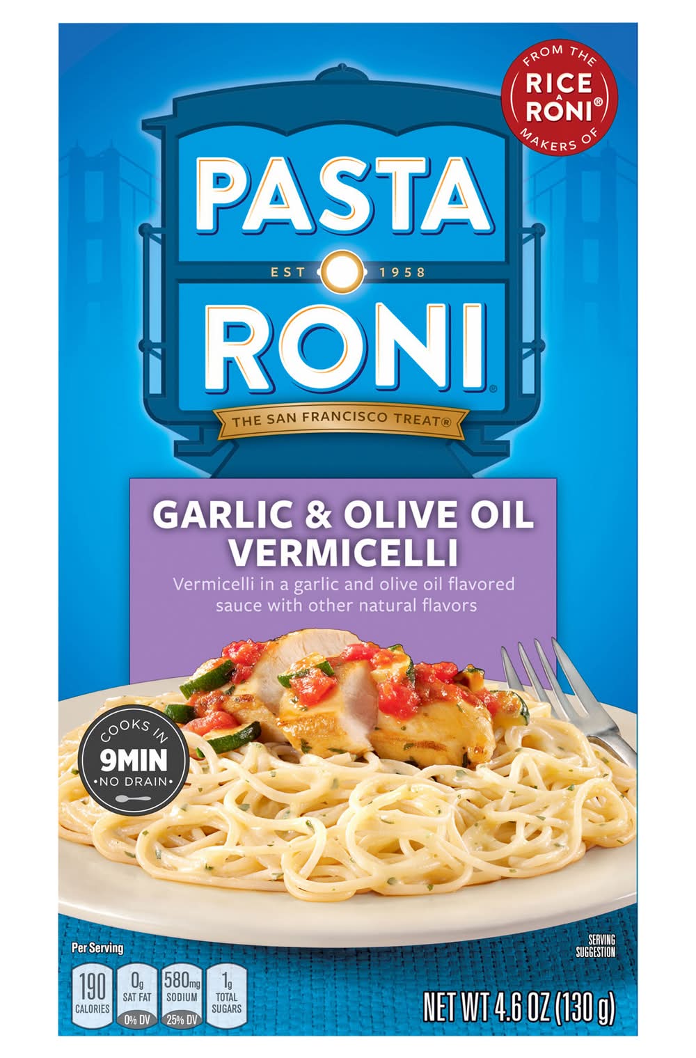 Vermicelli in a garlic and olive oil flavored sauce with other natural flavors. The San Francisco treat. Add chicken to make Pasta Roni a meal! Pasta cooks in 8 minutes. Quality guaranteed. Flavor: Garlic & olive oil