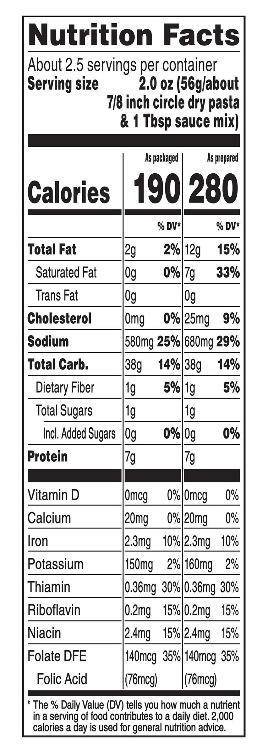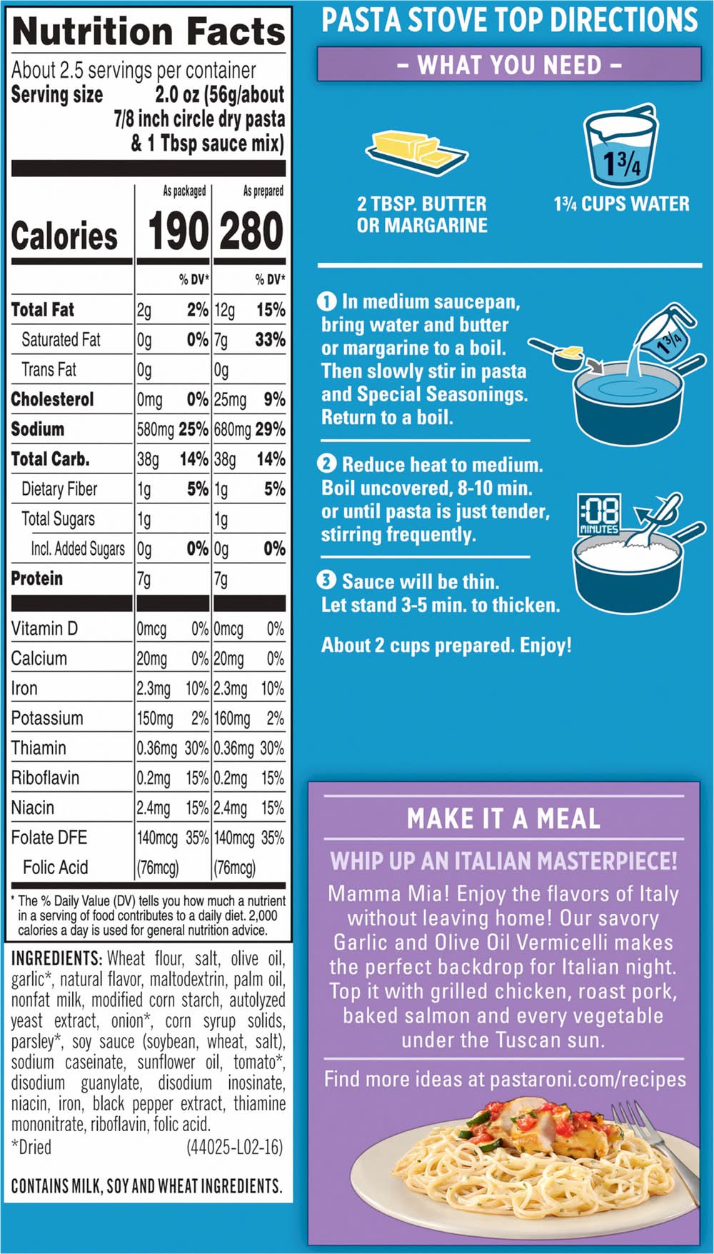 Safe handling instructions: this product is not ready-to-eat and must be thoroughly cooked before eating to prevent illness from potential bacteria in the product. do not eat or play with raw product; wash hands, utensils, and surfaces after handling. pasta stove top directions: what you need: 2 tbsp. butter or margarine, 1-3/4 cups water. 1. in medium saucepan, bring water and butter or margarine to a boil. then slowly stir in pasta and special seasonings, return to a boil. 2. reduce heat to medium. boil uncovered, 8-10 min. or until pasta is just tender, stirring frequently. 3. sauce will be thin. let stand 3-5 min. to thicken. about 2 cups prepared. enjoy! in 2-quart microwaveable bowl, combine 1-3/4 cups water, 2 tablespoons of butter or margarine, and pasta. microwave uncovered at high 4-5 minutes or until boiling. stir in special seasonings. microwave at high 7-8 minutes or until pasta is tender. sauce will be thin. let stand 3-5 minutes to thicken. microwave ovens vary; adjust times as needed. less fat directions: follow stove top or microwave directions, except replace butter with 1-1/2 teaspoons olive oil. fat reduced to 6 g from 12 g per serving. saturated fat reduced to 1 g from 2.5 g per serving. trans fat reduced to 0 g from 1.5 g per serving. see nutrition facts panel for sodium content. make it a meal: whip up an italian masterpiece! mamma mia! enjoy the flavors of italy without leaving home! our savory garlic and olive oil vermicelli makes the perfect backdrop for italian night. top it with grilled chicken, roast pork, baked salmon and every vegetable under the tuscan sun. find more ideas at pastaroni.com/recipes.