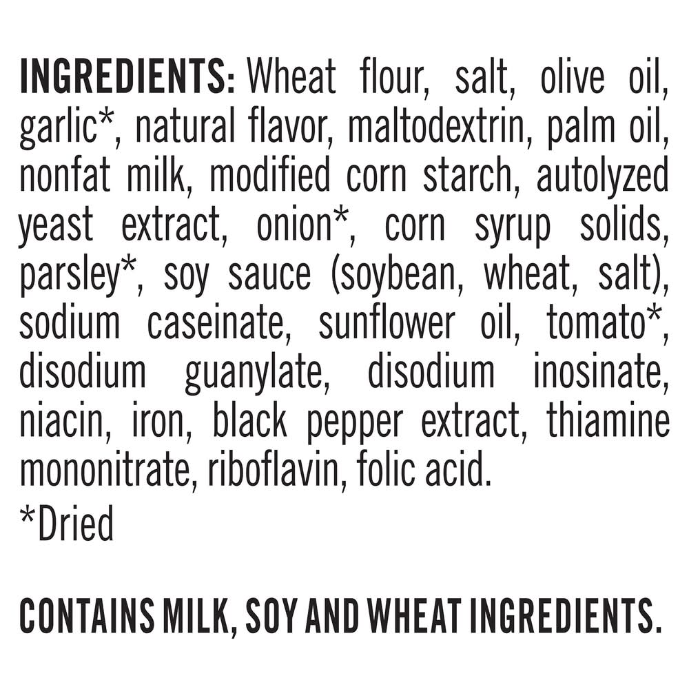 Ingredients: Wheat Flour, Salt, Olive Oil, Garlic (Dried), Natural Flavor, Maltodextrin, Palm Oil, Nonfat Milk, Modified Corn Starch, Autolyzed Yeast Extract, Onion (Dried), Corn Syrup Solids, Parsley (Dried), Soy Sauce (Soybean, Wheat, Salt), Sodium Caseinate, Sunflower Oil, Tomato (Dried), Disodium Guanylate, Disodium Inosinate, Niacin, Iron, Black Pepper Extract, Thiamine Mononitrate, Riboflavin, Folic Acid Contains: Wheat, Milk, Corn, Soybeans