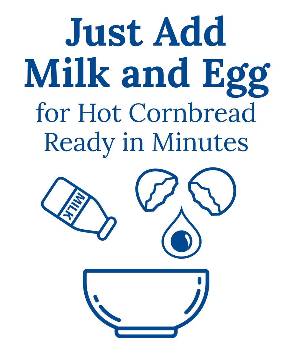You will need: 1/2 cup milk. 1 egg, beaten. 1. heat oven to 400 degrees f. grease with shortening or spray with non-stick cooking spray one 8-inch ovenproof skillet or square pan. place in oven for 7 to 8 minutes or until hot. 2. combine cornbread mix, milk and egg in small mixing bowl; stir until smooth. pour into hot skillet or pan. 3. bake at 400 degrees f for 17 to 22 minutes (directions developed using conventional ovens. ovens vary; cooking time may need to be adjusted) or until golden brown. double recipe: grease with shortening or spray with non-stick cooking spray one 10-1/2-inch ovenproof skillet or 9-inch square pan. place in oven for 7 to 8 minutes or until hot. prepare cornbread mix as directed above in basic recipe using 2 packages of mix, 1 cup milk and 2 eggs. bake at 400 degrees f for 17 to 22 minutes (directions developed using conventional ovens. ovens vary; cooking time may need to be adjusted) or until golden brown. muffins and cornsticks: lightly spray 6 to 8 muffin cups or cornstick pan with non-stick cooking spray. place in oven for 7 to 8 minutes or until hot. prepare batter as directed above in basic recipe. fill muffin cups or cornstick pan 2/3 full. bake at 375 degrees f for 16 to 19 minutes (directions developed using conventional ovens. ovens vary; cooking time may need to be adjusted) or until golden brown. please cook fully before enjoying.