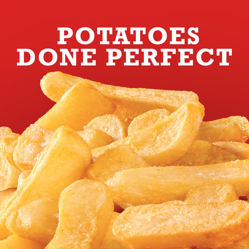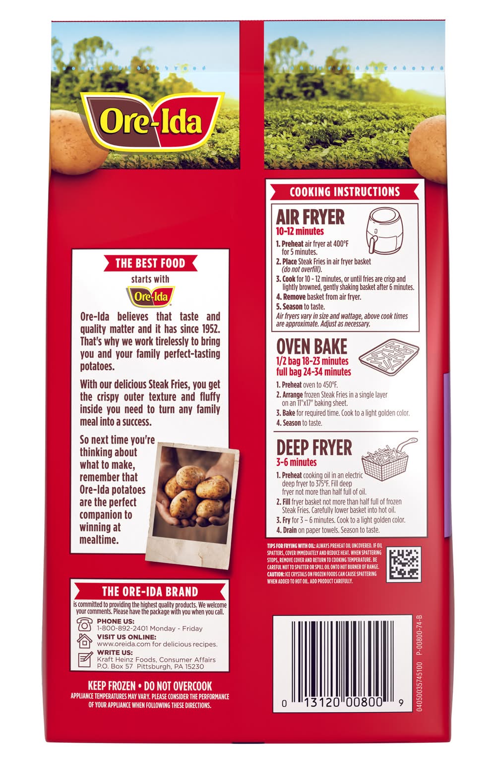 Directions for use: Bake: Oven Bake 1/2 Bag Instructions (serves about 3) • Preheat oven to 450°F. • Arrange frozen Steak Fries in a single layer on an 11"x17" baking sheet. • Heat for 18–23 minutes, flip halfway through cooking time. Cook to a light golden color. • Season to taste Full Bag Instructions (serves about 6) • Preheat oven to 450°F. • Arrange frozen Steak Fries in a single layer on an 11"x17" baking sheet. • Heat for 24–34 minutes, flip halfway through cooking time. Cook to a light golden color. • Season to taste. Deep Fry: Deep Fryer Tips for Frying with Oil: Always preheat oil uncovered. If oil spatters, cover immediately and reduce heat. When spattering stops, remove cover and return to cooking temperature. Be careful not to spatter or spill oil onto hot burner of range. • Preheat cooking oil in electric deep fryer to 375°F. Fill deep fryer not more than half full of oil. • Fill fryer basket not more than half full of frozen Steak Fries. Carefully lower basket into hot oil. • Fry 3–6 minutes. Cook to a light golden color. • Drain on paper towels. Season to taste. Pan Fry: Pan Fry • Heat 1/4 cup cooking oil in large skillet over medium-high heat. • Carefully add frozen Steak Fries to form a single layer. • Fry 6–9 minutes, turning frequently. Cook to a light golden color. • Drain on paper towels. Season to taste. Air Fryer • Preheat fryer at 400°F. • Place fries in the basket in a single layer. • Heat for 6 minutes. • Remove basket and shake (to evenly heat the potato pieces). • Heat for another 6 minutes. Take temp to ensure reaching 165°F internal temp. Season to taste. Keep frozen. Storage recommendation: Keep frozen.