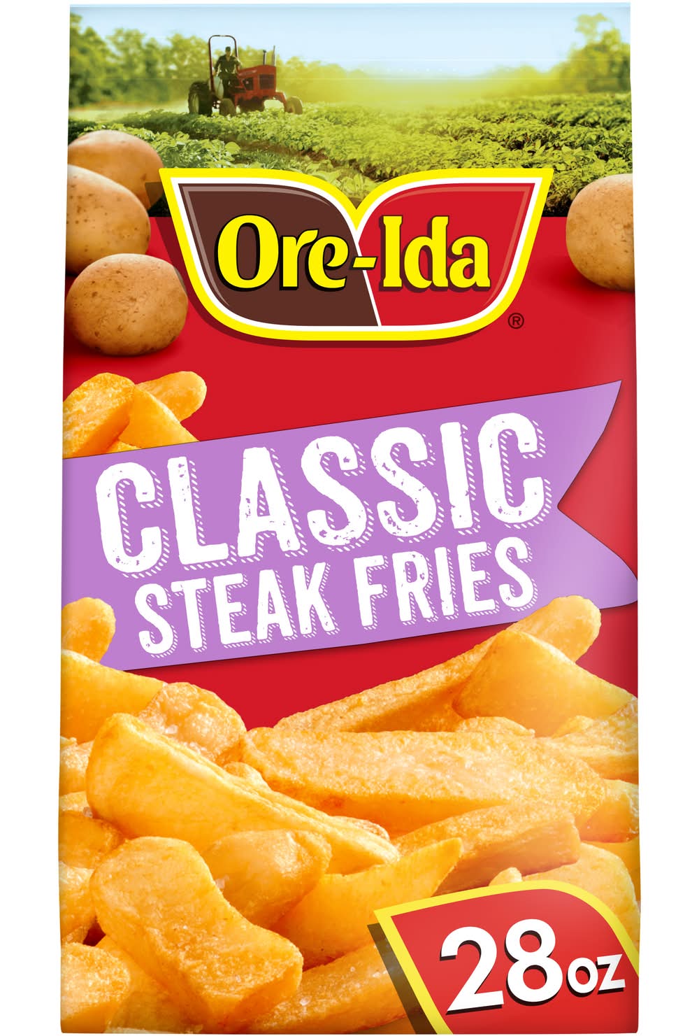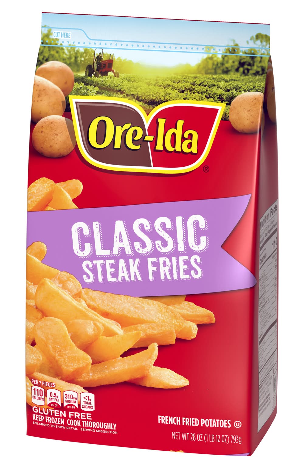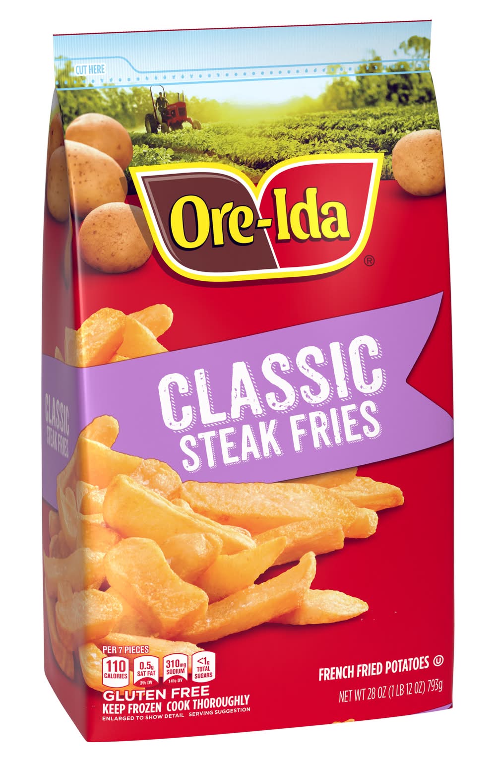 Ore-Ida Golden Steak Fries make it easy to enjoy delicious fries at home. Crispy and golden, these Grade A fries are made from freshly peeled, American grown potatoes cut into thick fries. These gluten free fries offer a crispy outside with a fluffy inside for the perfect blend of textures to make your next family meal a success. Toss these frozen fries on a baking sheet to bake them in the oven according to package instructions for perfect golden fries. An American classic, these easy fries are perfect for dipping. Serve up the traditional burger and fries, or get creative with loaded steak fries topped with cheese and bacon. These oven baked fries come sealed in a 28 ounce bag to help lock in flavor. Your family deserves the highest quality because if it's not Grade A, it's not Ore-Ida! Kraft Heinz Foods Company, Pittsburgh, PA, 15222