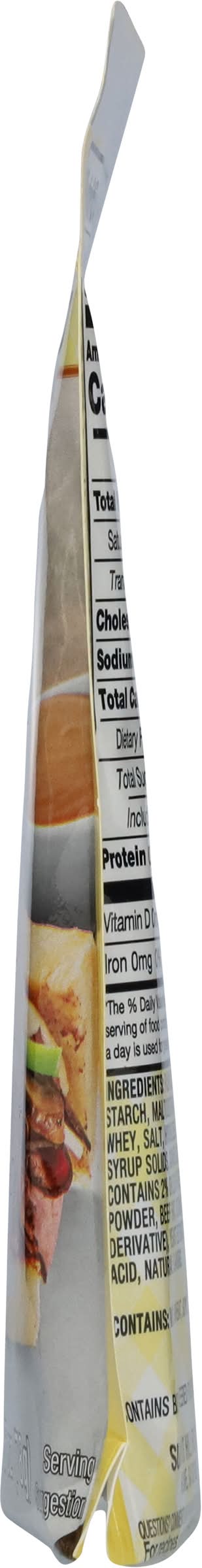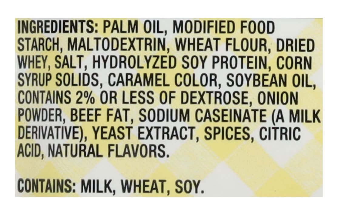 Ingredients: Palm Oil, Modified Food Starch, Maltodextrin, Wheat Flour, Dried Whey, Salt, Hydrolyzed Soy Protein, Corn Syrup Solids, Caramel Color, Soybean Oil, Contains 2% or Less of Dextrose, Onion Powder, Beef Fat, Sodium Caseinate (a Milk Derivative), Yeast Extract, Spices, Citric Acid, Natural Flavors Contains: Milk, Wheat, Soybeans, Corn