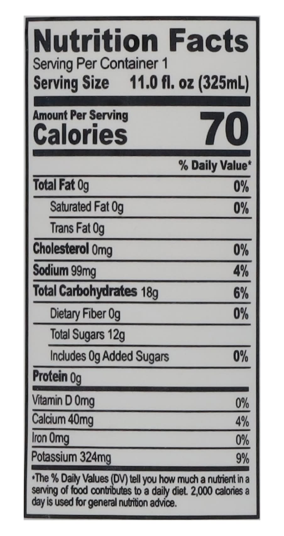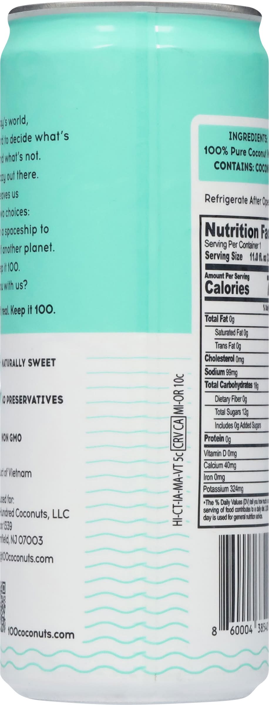 Pure coconut water for natural hydration, filled with potassium, nutrients, and electrolytes. This product is fat-free, gluten-free, and NON-GMO project verified. Only 50 calories per serving and no added sugar, this drink is a great alternative to soft drinks, sports drinks, fruit juices, and water. • Number of servings: 1 • One Hundred Coconuts, LLC, Bloomfield, NJ, 07003, Ph: 201-864-1097