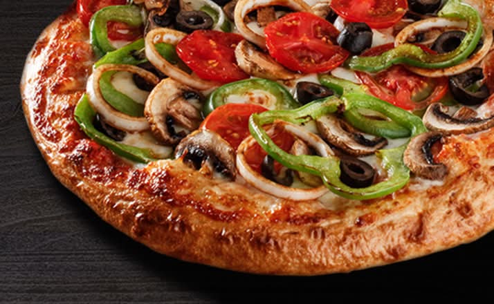 Mozzarella, black olives, fresh mushrooms, onions, green pepper, tomatoes.