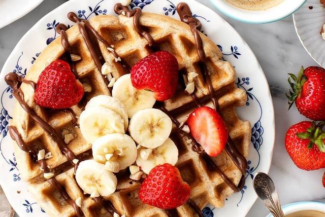 4 Delicious and fluffy waffles coated in Nutella and topped with banana , maple syrup and whipped cream