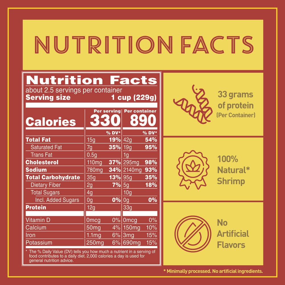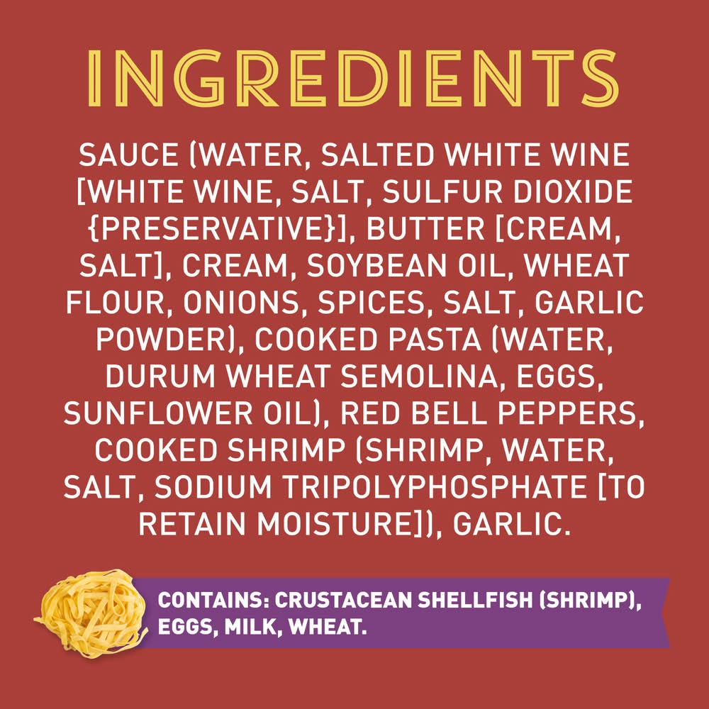 Ingredients: Sauce (Water, Salted White Wine [White Wine, Salt, Sulfur Dioxide {Preservative}], Butter [Cream, Salt], Cream, Soybean Oil, Wheat Flour, Onions, Spices, Salt, Garlic Powder), Cooked Pasta (Water, Durum Wheat Semolina, Eggs, Sunflower Oil), Red Bell Peppers, Cooked Shrimp (Shrimp, Water, Salt, Sodium Tripolyphosphate [To Retain Moisture]), Garlic. CONTAINS: CRUSTACEAN SHELLFISH (SHRIMP), EGG, MILK, WHEAT. Contains: Egg, Milk, Shellfish, crustacean - shrimp, Wheat