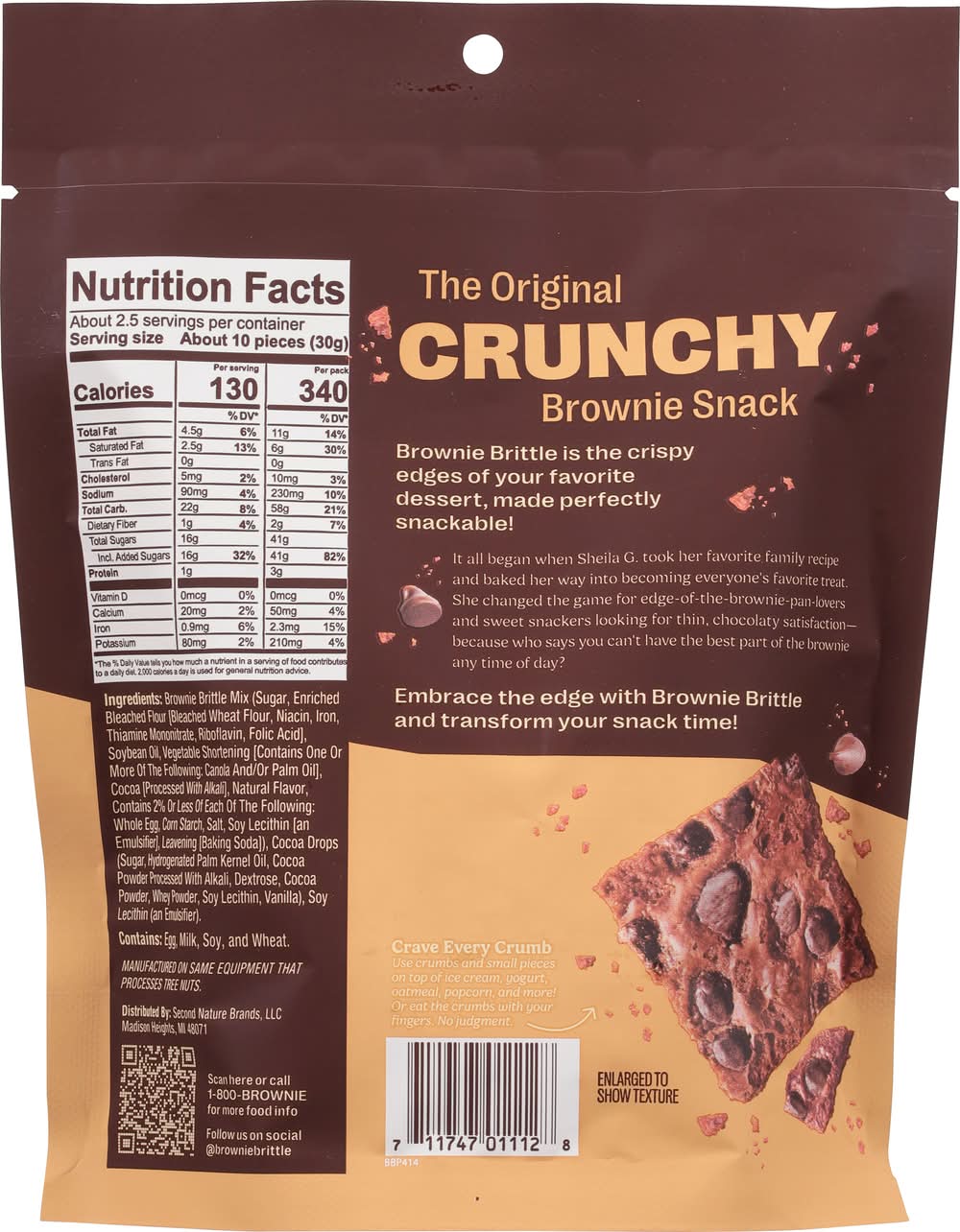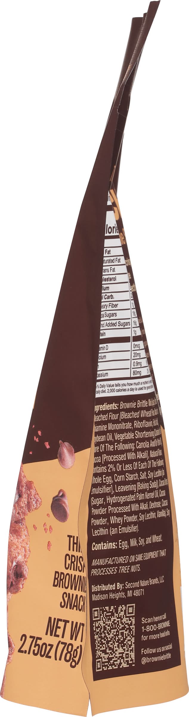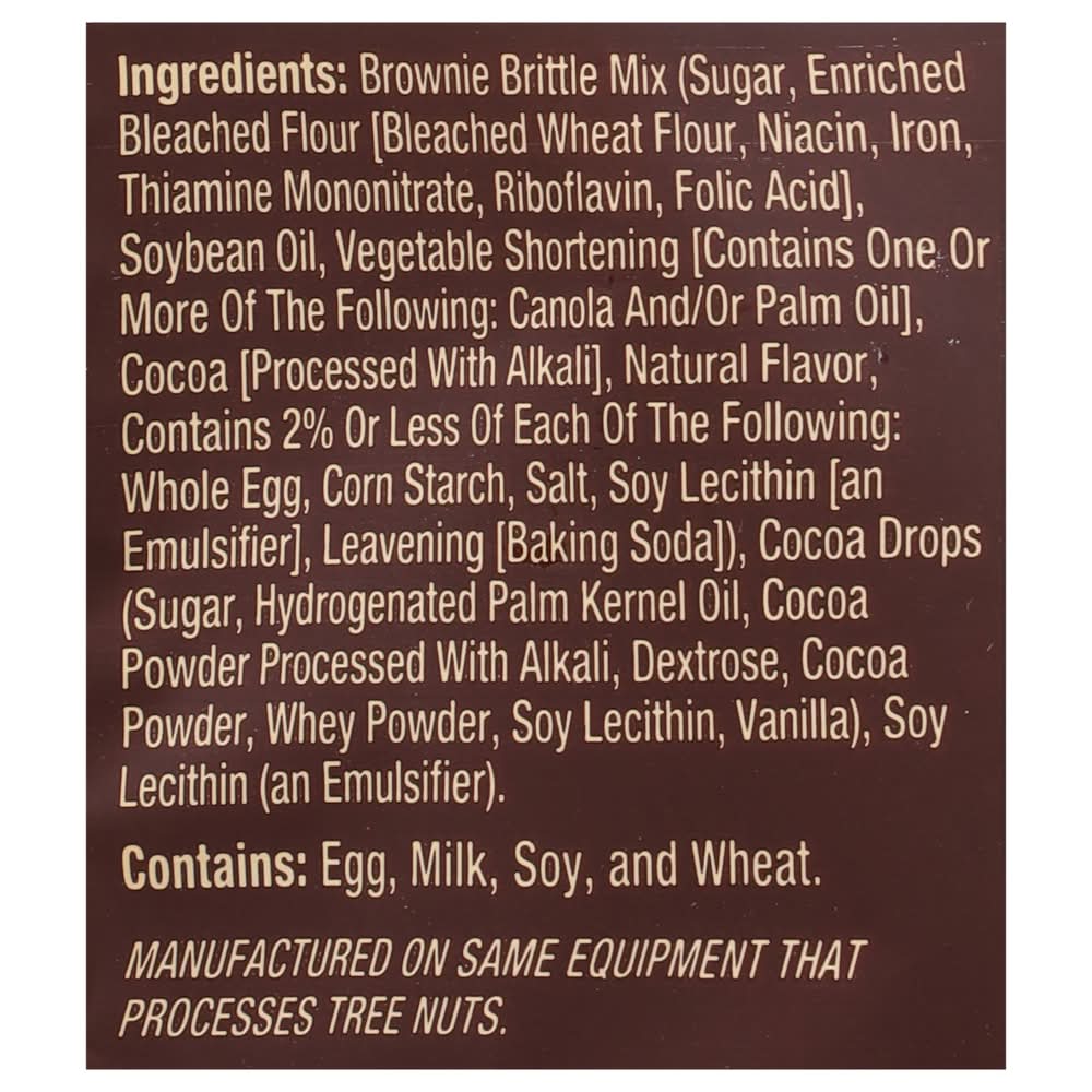 Ingredients: Brownie Brittle Mix (Sugar, Enriched Bleached Flour [Bleached Wheat Flour, Niacin, Iron, Thiamine Mononitrate, Riboflavin, Folic Acid], Soybean Oil, Vegetable Shortening [Contains One or More of the Following: Canola and/or Palm Oil], Cocoa [Processed with Alkali], Natural Flavor, Contains 2% or Less of Each of the Following: Whole Egg, Corn Starch, Salt, Soy Lecithin [an Emulsifier], Leavening [Baking Soda]), Cocoa Drops (Sugar, Hydrogenated Palm Kernel Oil, Cocoa Powder Processed with Alkali, Dextrose, Cocoa Powder, Whey Powder, Soy Lecithin, Vanilla), Soy Lecithin (an Emulsifier) Contains: Eggs, Milk, Soybeans, Wheat, Tree Nuts