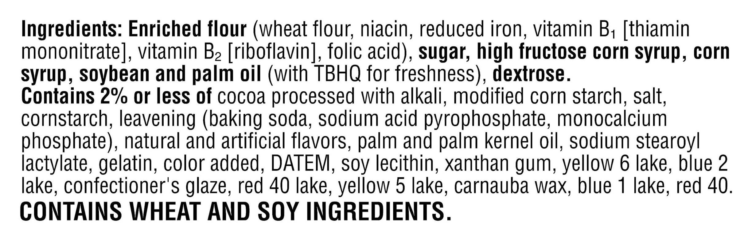 Ingredients: Enriched Flour (Wheat Flour, Niacin, Reduced Iron, Vitamin B, [Thiamin Mononitrate], Vitamin B2 [Riboflavin], Folic Acid), Sugar, High Fructose Corn Syrup, Corn Syrup, Soybean and Palm Oil (with TBHQ for Freshness), Dextrose, Contains 2% or Less of Cocoa Processed with Alkali, Modified Corn Starch, Salt, Cornstarch, Leavening (Baking Soda, Sodium Acid Pyrophosphate, Monocalcium Phosphate), Natural and Artificial Flavors, Palm and Palm Kernel Oil, Sodium Stearoyl Lactylate, Gelatin, Color Added, DATEM, Soy Lecithin, Xanthan Gum, Yellow 6 Lake, Blue 2 Lake, Confectioner's Glaze, Red 40 Lake, Yellow 5 Lake, Carnauba Wax, Blue 1 Lake, Red 40 Contains: Wheat, Soybeans