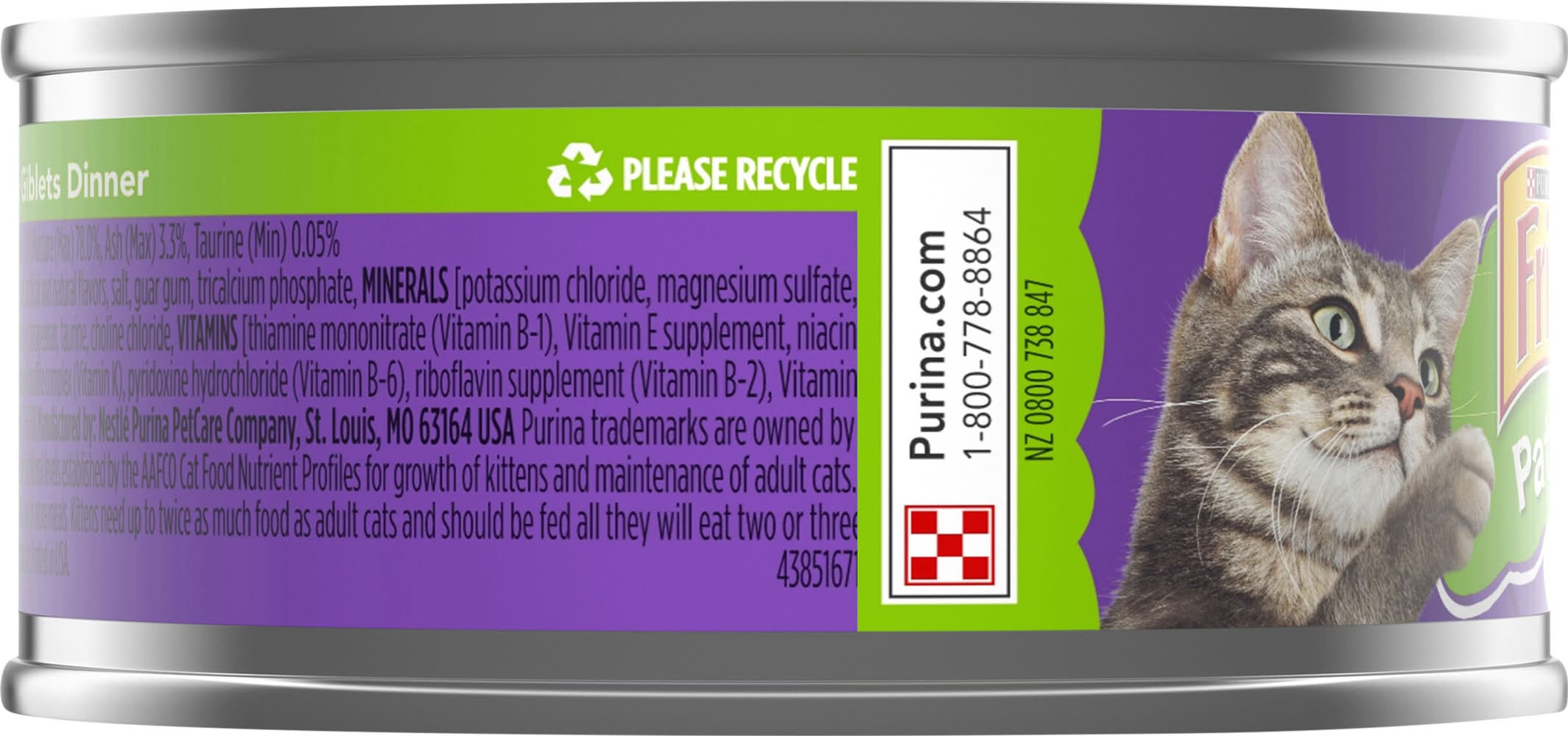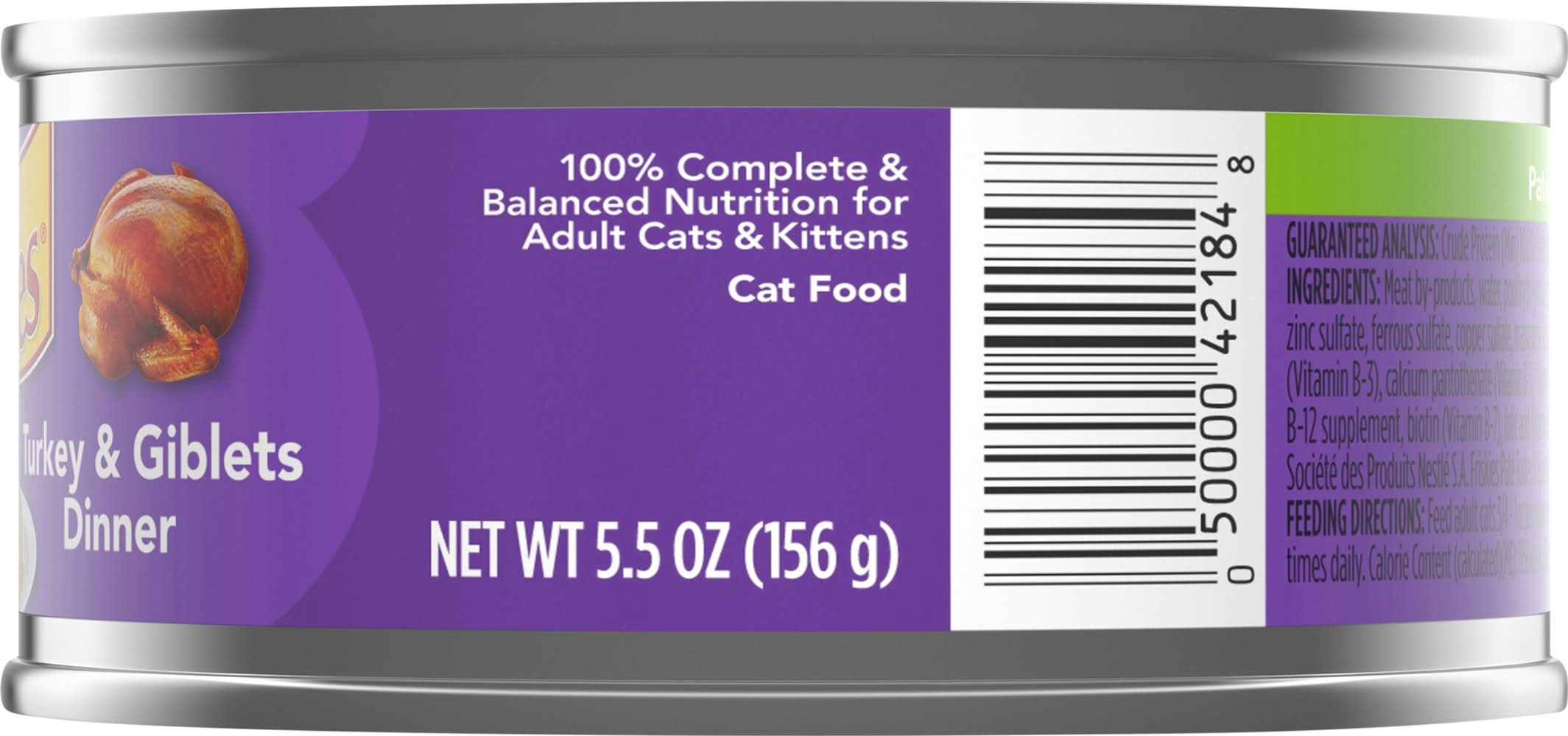 This scrumptiously adventurous canned cat food entree contains two of her favorite flavors real giblets and turkey in one meaty combination that she can dive into whiskers first to satisfy her hunger for poultry, leaving behind only a clean dish and a contented purr at mealtime. Even the pickiest feline is unable to resist the delectable cat food flavor combination in this moist and delicious recipe featuring a classic pate soft cat food texture that's easy for her small mouth to handle. Ideal for both adults and kittens, this yummy pate cat food recipe provides, so you can feel good about giving her the lip-smacking goodness she desires along with the good-for-her stuff her body needs for every playful romp. • Size: Adult • Nestle Purina PetCare Company, St. Louis,MO,63164 • Packaging: Reusable