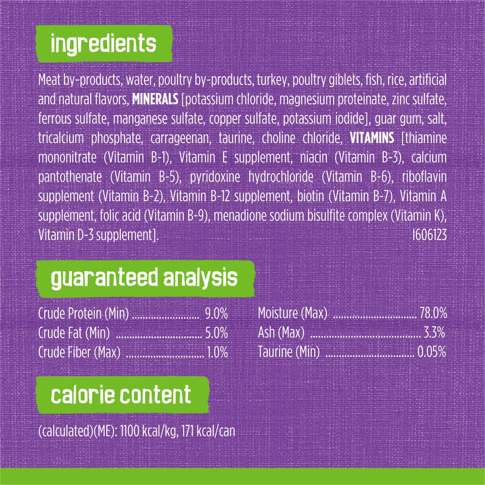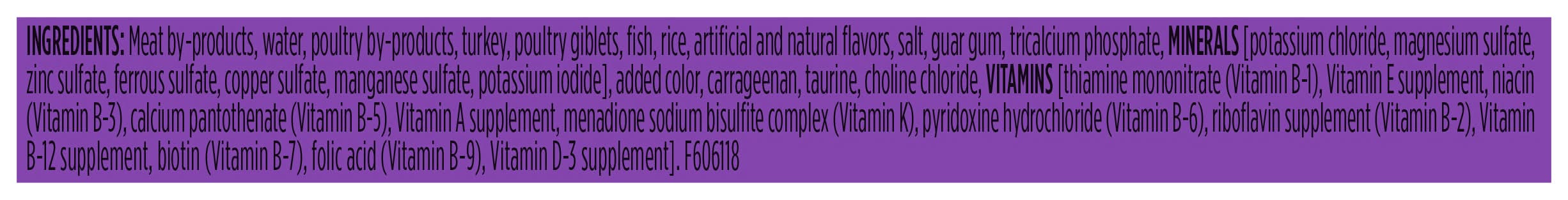 Ingredients: Meat By-Products, Water, Poultry By-Products, Turkey, Poultry Giblets, Fish, Rice, Artificial And Natural Flavors, MINERALS [Potassium Chloride, Magnesium Proteinate, Zinc Sulfate, Ferrous Sulfate, Manganese Sulfate, Copper Sulfate, Potassium Iodide], Guar Gum, Salt, Tricalcium Phosphate, Carrageenan, Taurine, Choline Chloride, VITAMINS [Thiamine Mononitrate (Vitamin B-1), Vitamin E Supplement, Niacin (Vitamin B-3), Calcium Pantothenate (Vitamin B-5), Pyridoxine Hydrochloride (Vitamin B-6), Riboflavin Supplement (Vitamin B-2), Vitamin B-12 Supplement, Biotin (Vitamin B-7), Vitamin A Supplement, Folic Acid (Vitamin B-9), Menadione Sodium Bisulfite Complex (Vitamin K), Vitamin D-3 Supplement], .\t\tI606123 Contains: Fish, Sulfites