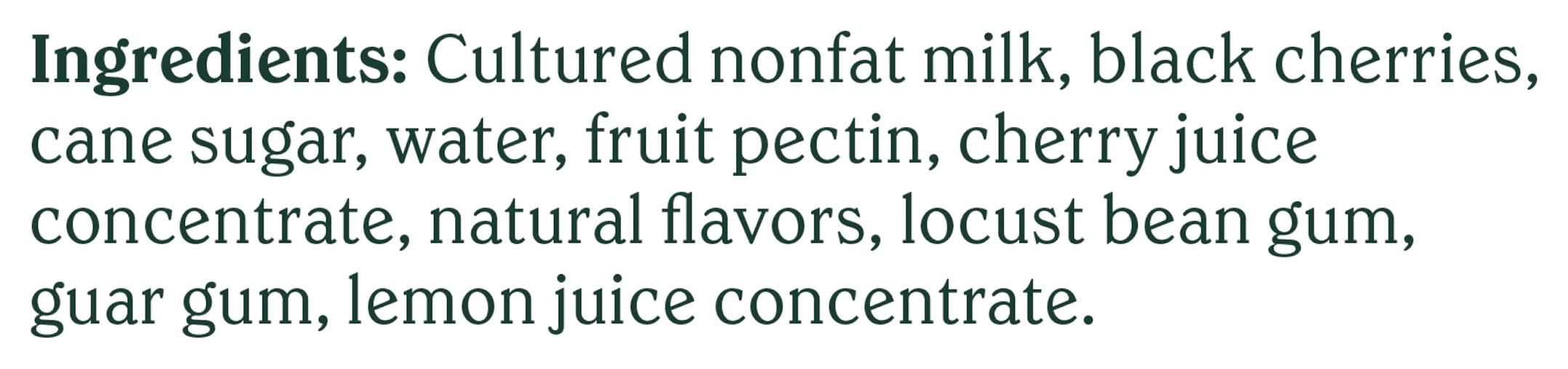 Ingredients: Cultured Nonfat Milk, Cane Sugar, Black Cherries, Water, Fruit Pectin, Guar Gum, Natural Flavors, Cherry Juice Concentrate, Locust Bean Gum, Lemon Juice Concentrate. 6 Live and Active Cultures: S. Thermophilus, L. Bulgaricus, L. Acidophilus, Bifidus, L. Casei, and L. Rhamnosus