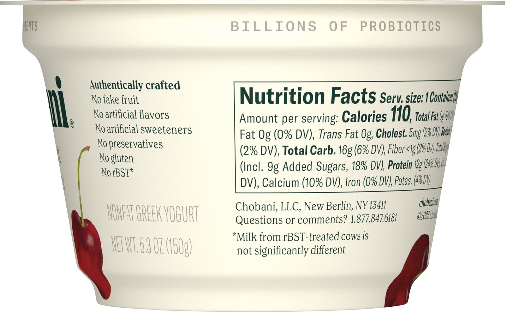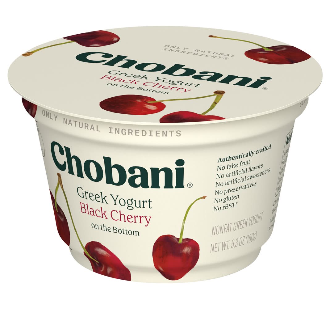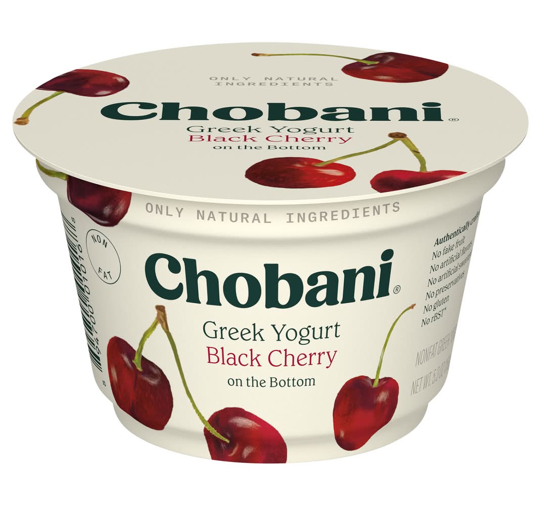 No artificial flavors. Nonfat. No gluten. 0% milkfat. Billions of probiotics. Protein rich. Authentically crafted. No fake fruit. No artificial sweeteners. No preservatives. No rBST (Milk from rBST-treated cows is not significantly different). • Flavor: Black cherry • Chobani, LLC, New Berlin, NY, 13411