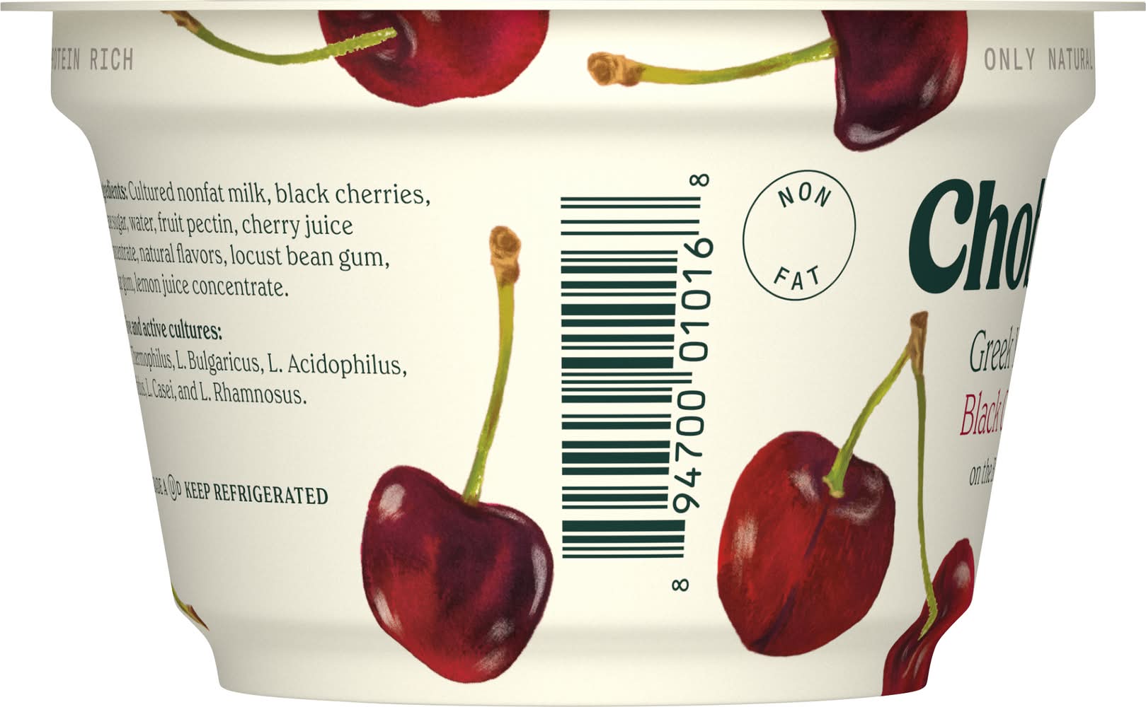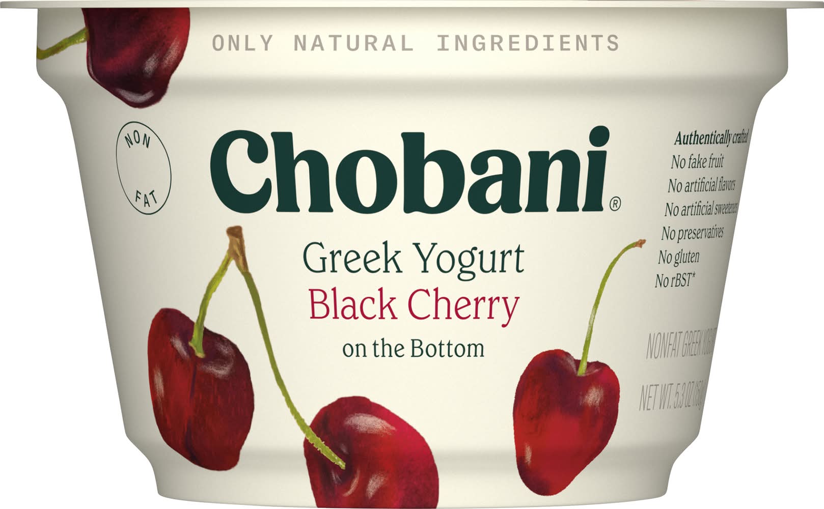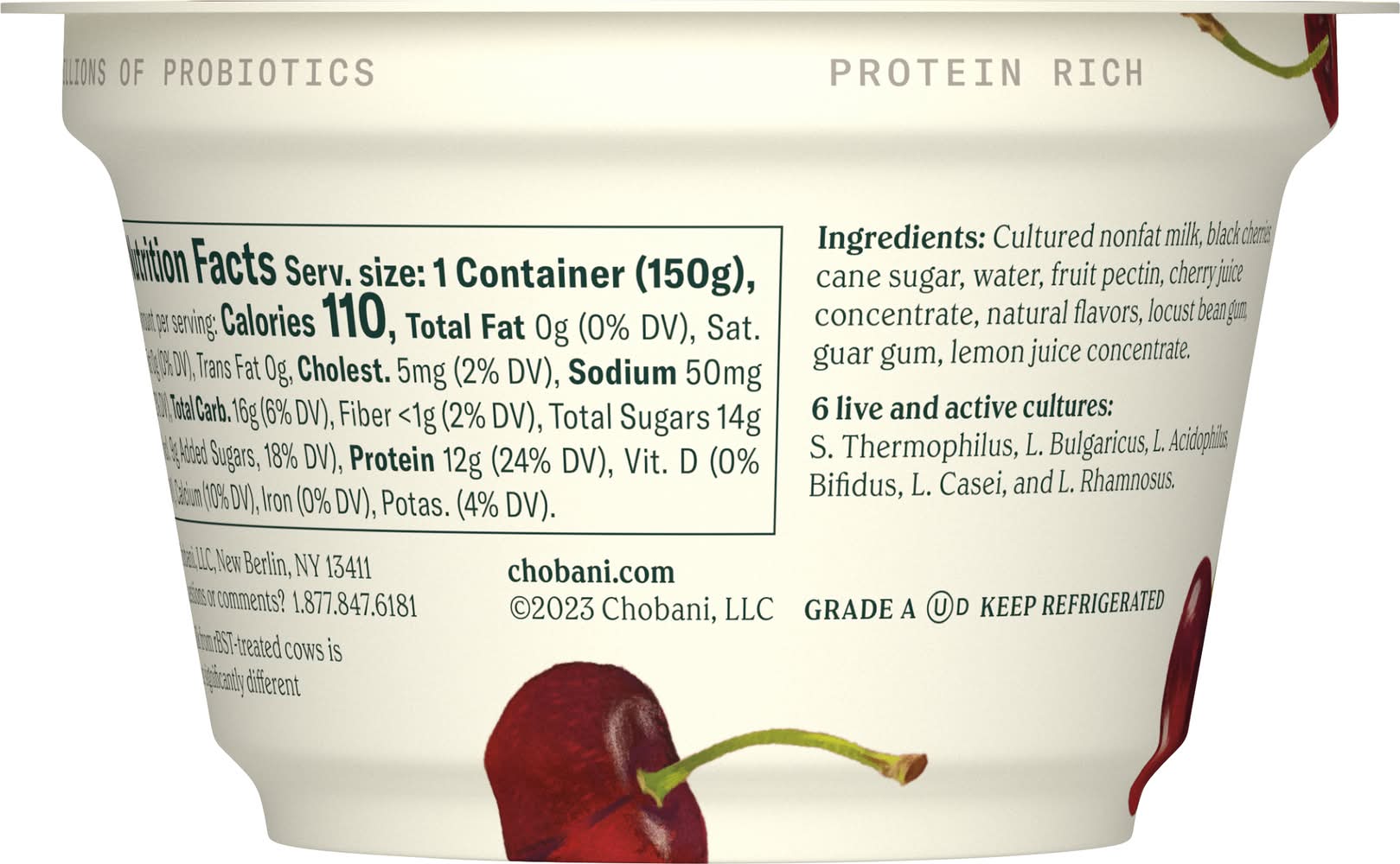 No artificial flavors. Nonfat. No gluten. 0% milkfat. Billions of probiotics. Protein rich. Authentically crafted. No fake fruit. No artificial sweeteners. No preservatives. No rBST (Milk from rBST-treated cows is not significantly different). • Flavor: Black cherry • Chobani, LLC, New Berlin, NY, 13411