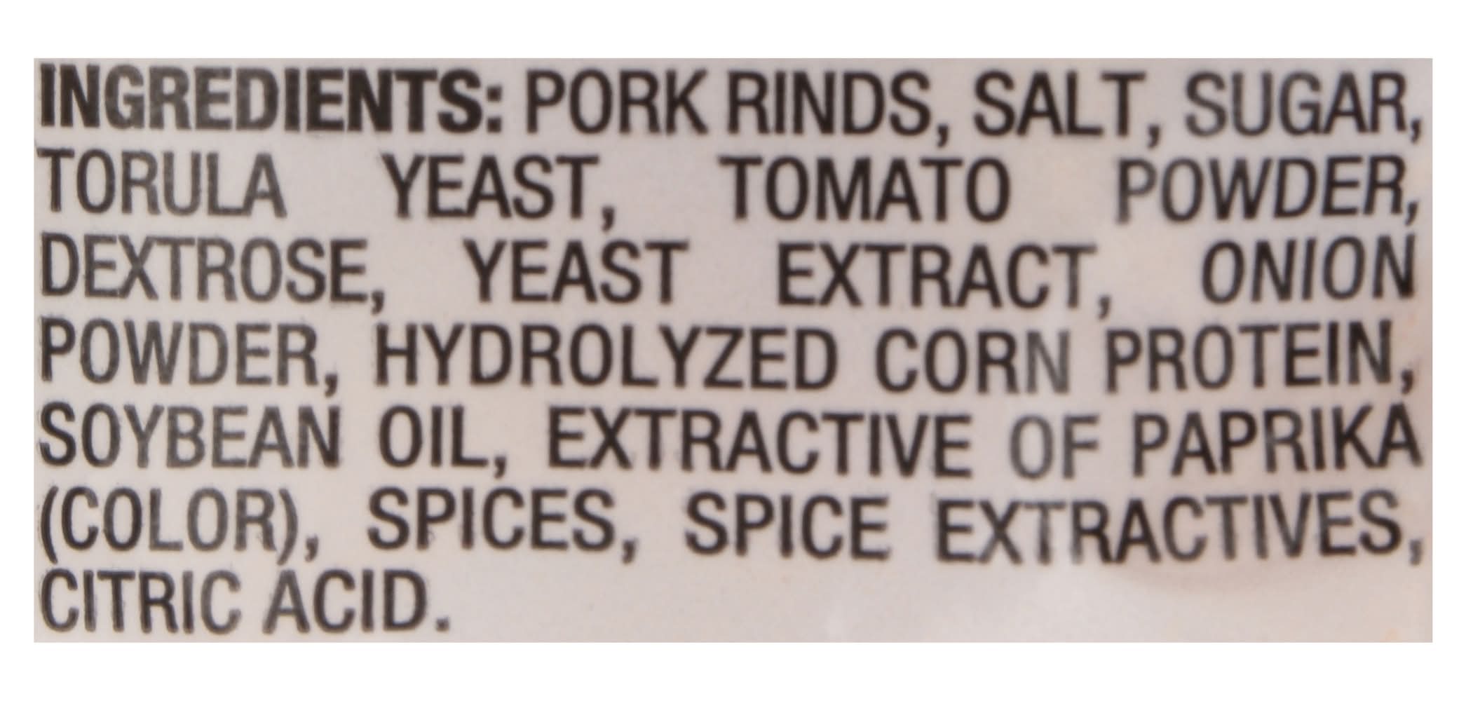 Ingredients: Pork Rinds, Salt, Sugar, Torula Yeast, Tomato Powder, Dextrose, Yeast Extract, Onion Powder, Hydrolyzed Corn Protein, Soybean Oil, Extractive of Paprika (Color), Spices, Spice Extractives, Citric Acid Contains: Corn, Soybeans