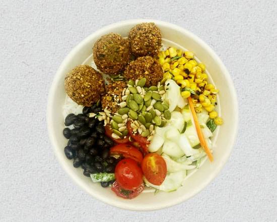 Delight in crispy edamame falafel, cucumber namasu, roasted corn, marinated tomato, black beans, rice, seeds, & tzatziki dressing. (Dressing tossed on greens).