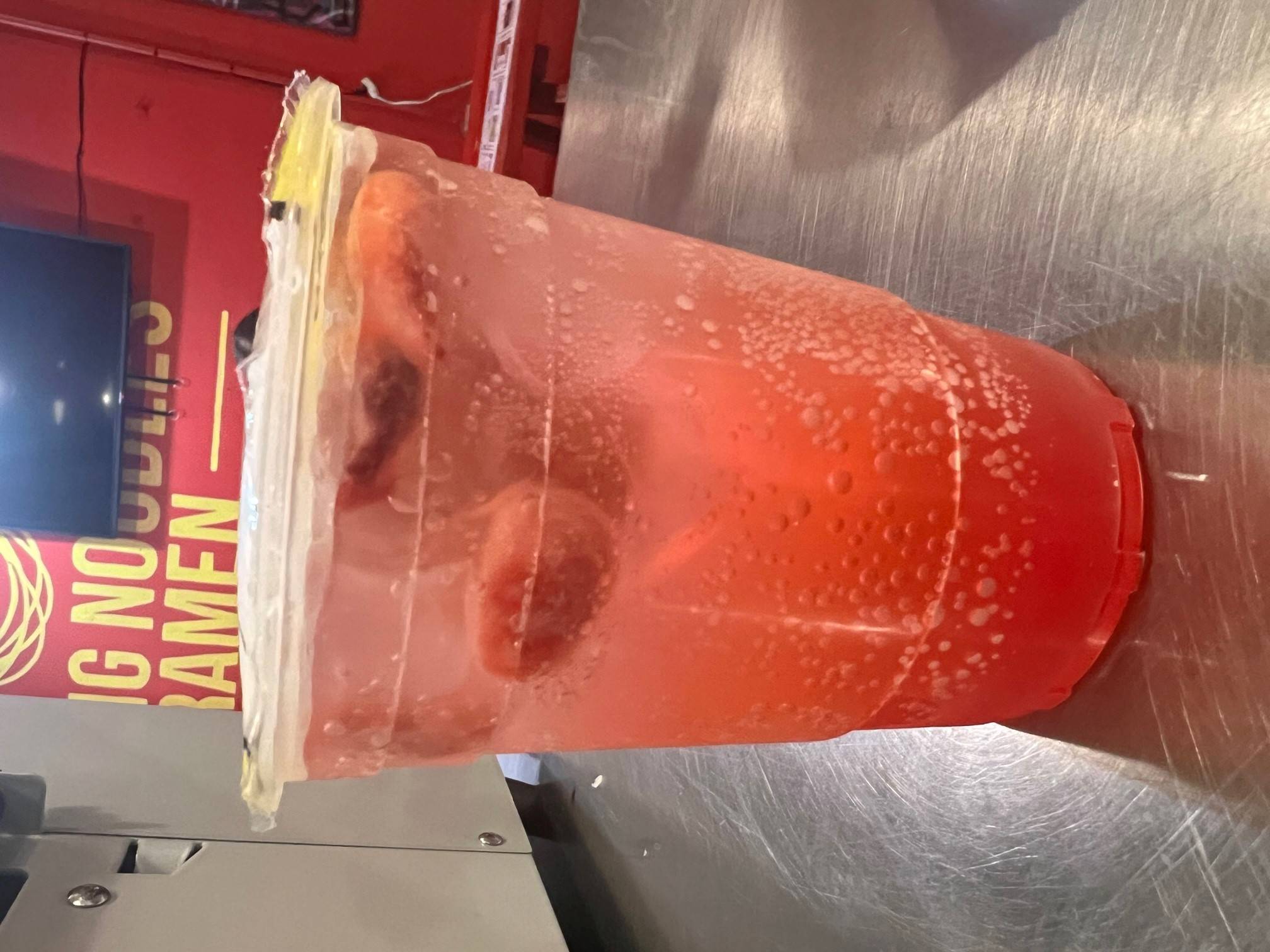 Lychee strawberry flavored soda with sliced strawberry. Optional toppings available.