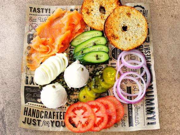 Freshly baked bagel, cream cheese, smoked salmon, capers, onion, sliced cucumbers & tomatoes.