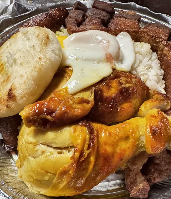 Accompanado con 1/4 de Pollo, Chicharron, Arroz, Frijoles, Maduro, Huevo Frito, Arepa y Aguacate Served with 1/4 Chicken, Pork Crackling, Rice, Beans, Sweet Plantain, Egg, Corn Cake and Avocado.