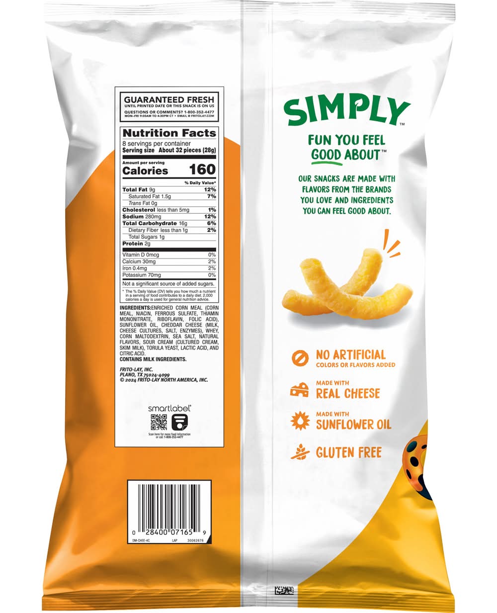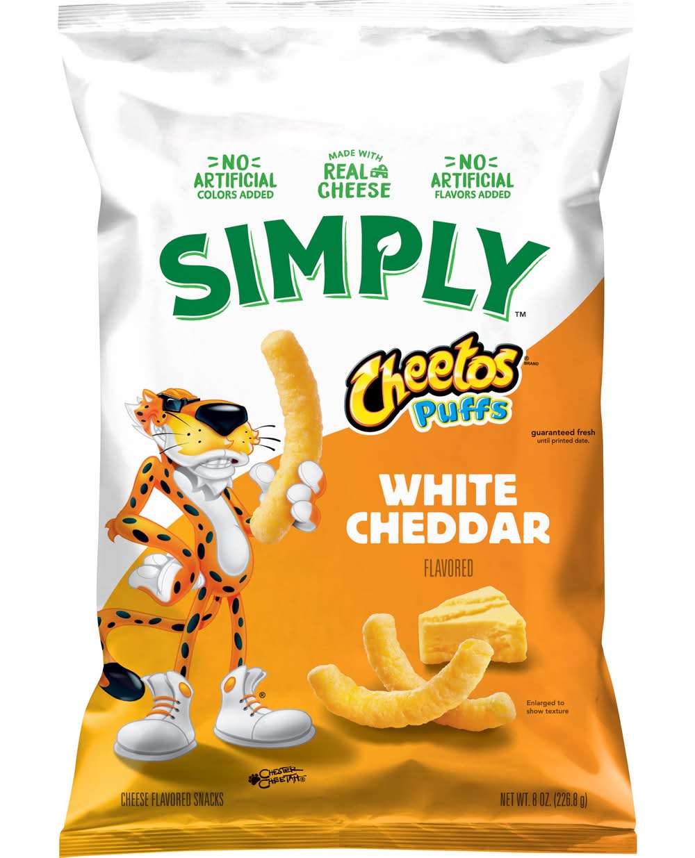 Simply put, Simply snacks have great taste, with no artificial flavors or preservatives. They're the snack that you feel good about sharing with the people you love most. Delicious Simply Cheetos Puffs White Cheddar Snacks are a treat to enjoy with the whole family! • Flavor: White cheddar • Size: 8 OZ • Frito-Lay, Inc., Plano, TX
