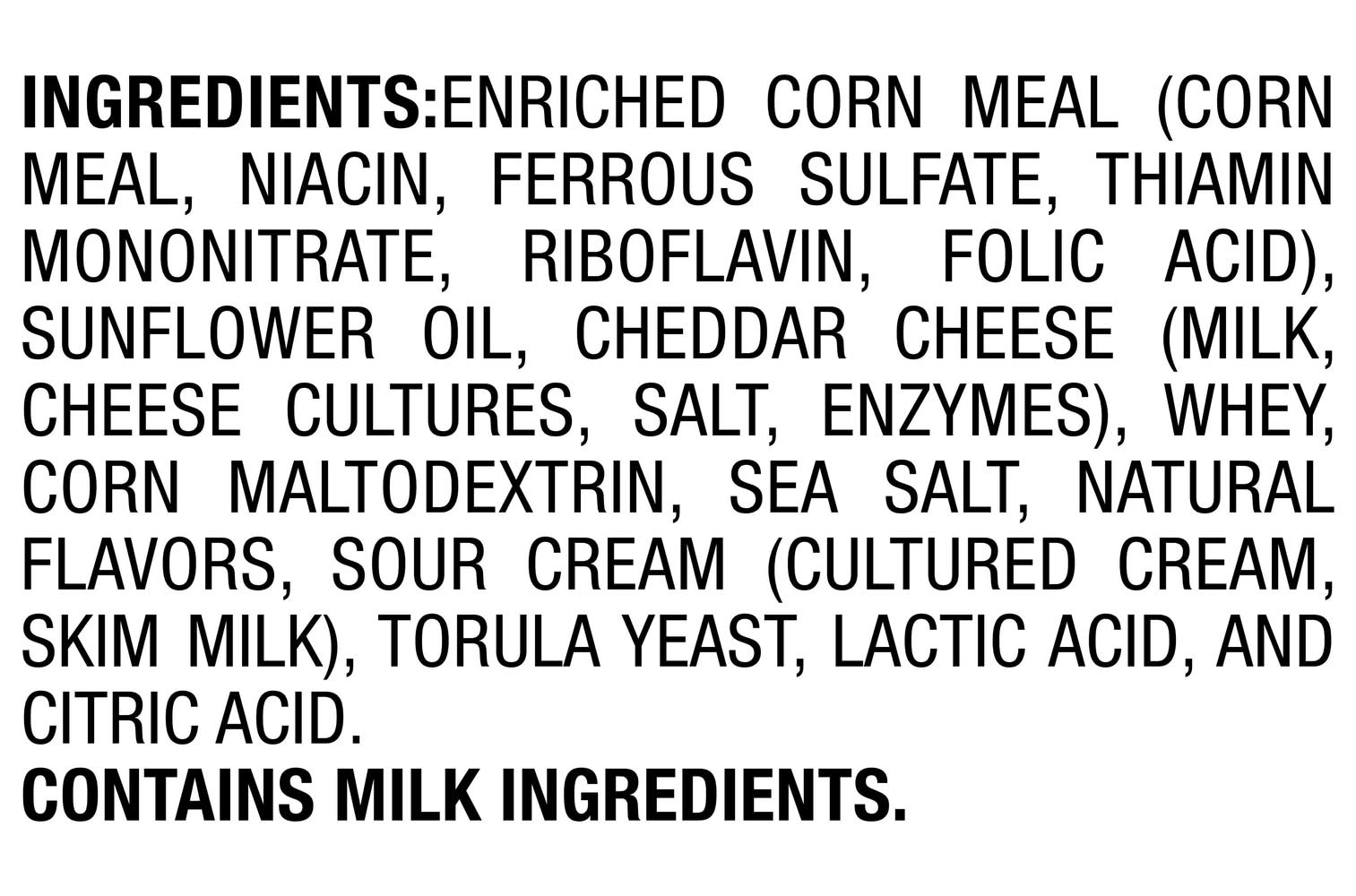 Ingredients: Enriched Corn Meal (Corn Meal, Niacin, Ferrous Sulfate, Thiamin Mononitrate, Riboflavin, Folic Acid), Sunflower Oil, Cheddar Cheese (Milk, Cheese Cultures, Salt, Enzymes), Whey, Corn Maltodextrin, Sea Salt, Natural Flavors, Sour Cream (Cultured Cream, Skim Milk), Torula Yeast, Lactic Acid, And Citric Acid. CONTAINS MILK INGREDIENTS. Contains: Contains Milk Ingredients.