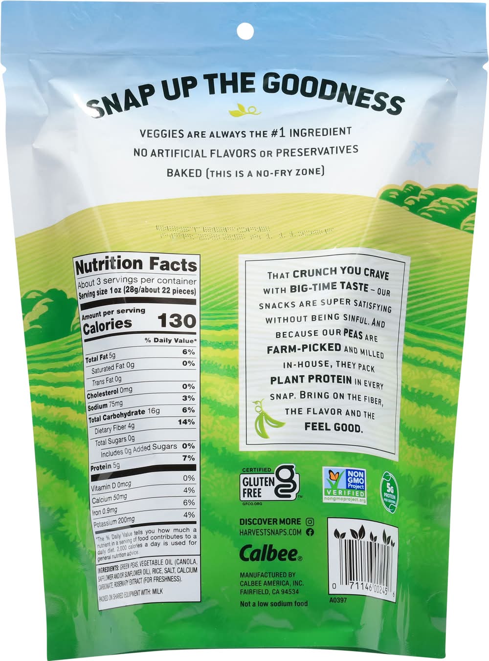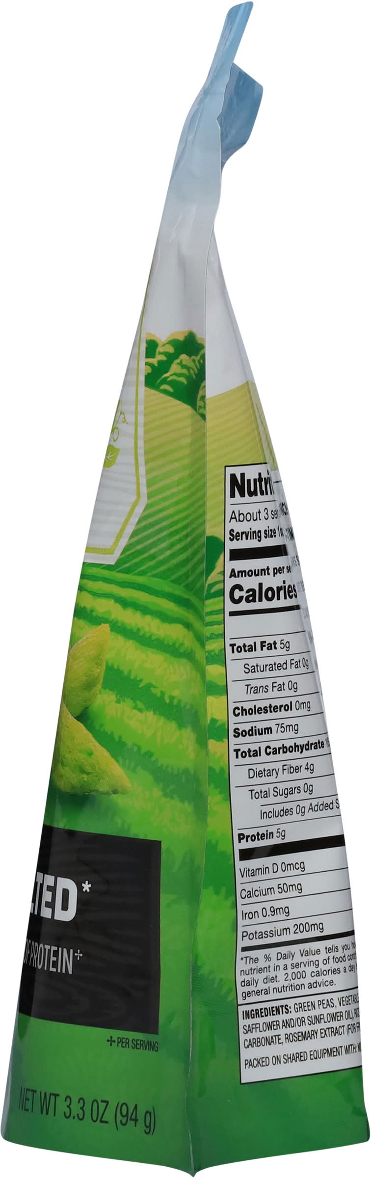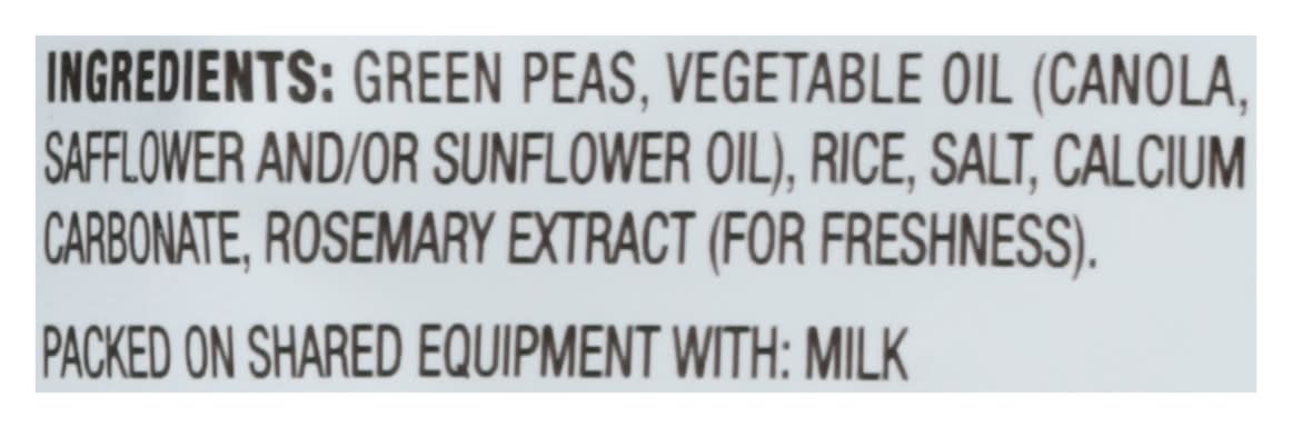Ingredients: Green Peas, Vegetable Oil (Canola, Safflower and/or Sunflower Oil), Rice, Salt, Calcium Carbonate, Rosemary Extract (for Freshness) Contains: Milk