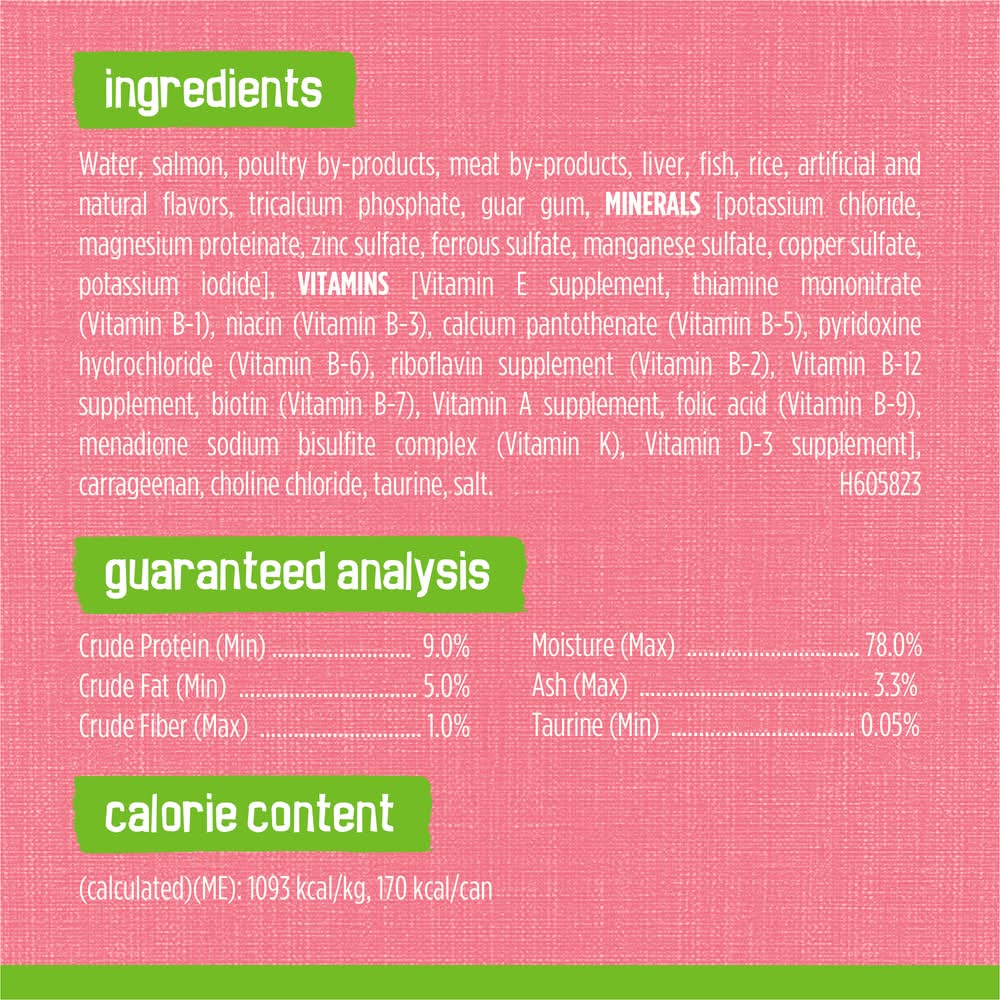 Ingredients: Water, Salmon, Poultry By-Products, Meat By-Products, Liver, Fish, Rice, Artificial And Natural Flavors, Tricalcium Phosphate, Guar Gum, MINERALS [Potassium Chloride, Magnesium Proteinate, Zinc Sulfate, Ferrous Sulfate, Manganese Sulfate, Copper Sulfate, Potassium Iodide], VITAMINS [Vitamin E Supplement, Thiamine Mononitrate (Vitamin B-1), Niacin (Vitamin B-3), Calcium Pantothenate (Vitamin B-5), Pyridoxine Hydrochloride (Vitamin B-6), Riboflavin Supplement (Vitamin B-2), Vitamin B-12 Supplement, Biotin (Vitamin B-7), Vitamin A Supplement, Folic Acid (Vitamin B-9), Menadione Sodium Bisulfite Complex (Vitamin K), Vitamin D-3 Supplement], Carrageenan, Choline Chloride, Taurine, Salt.\tH605823 Contains: Fish
