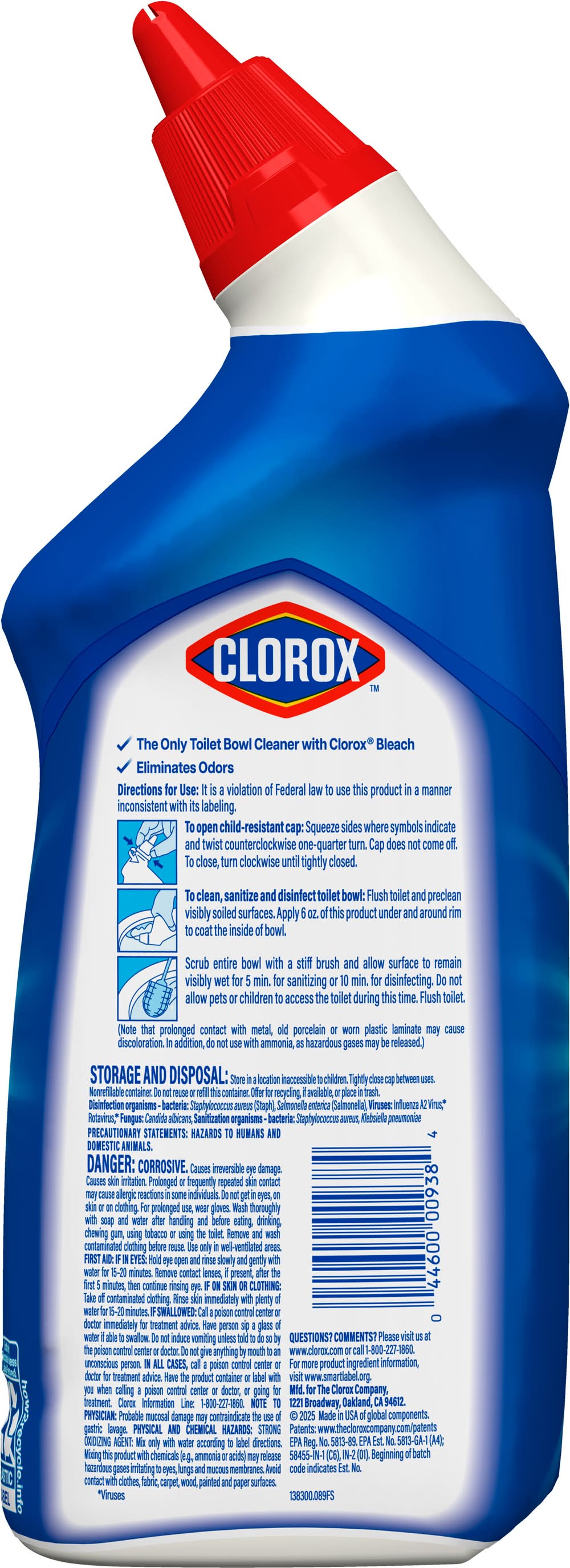 Clorox Toilet Bowl Cleaner with Bleach kills 99.9%, including COVID-19* Virus, of germs and whitens and brightens your toilet bowl with the trusted power of Clorox Bleach. This powerful bleach cleans your toilet bowl while it destroys tough stains, disinfects and eliminates odors with a refreshing Rain Clean Scent. The only toilet bowl cleaner with Clorox Bleach, it cleans and leaves toilets sparkling and bright. Clorox Toilet Bowl Cleaner with Bleach deodorizes as it whitens and brightens. Uniquely angled, this dispensing nozzle makes it easy to tackle hard-to-reach areas under the bowl rim with a simple squeeze of the bottle. Flush toilet. Apply six ounces under and around the rim. Scrub entire bowl. Let sit for 5 minutes. Flush toilet. Disinfect and get your toilet squeaky clean with Clorox Toilet Bowl Cleaner with Bleach. *Kills SARS-CoV-2 on hard, nonporous surfaces. • Size: 24 OZ • The clorox company, 1221 Broadway, Oakland, CA, 94612, • Packaging: Reusable