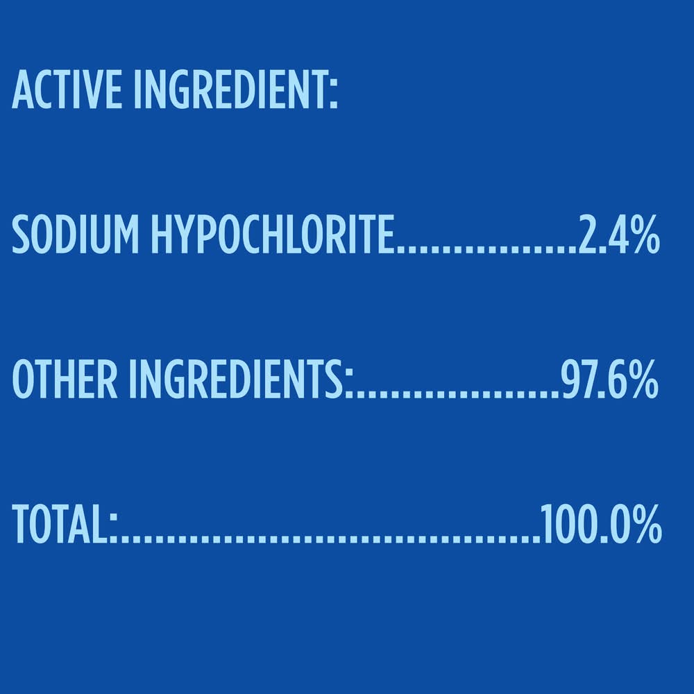 Ingredients: Sodium Hypochlorite 2.4%. Other ingredients: 97.6%. TOTAL: 100.0% Contains: Does Not Contain Declaration Obligatory Allergens