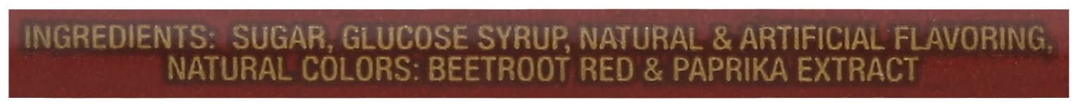 Ingredients: Sugar, Glucose Syrup, Natural & Artificial Flavoring, Natural Colors: Beetroot Red & Paprika Extract
