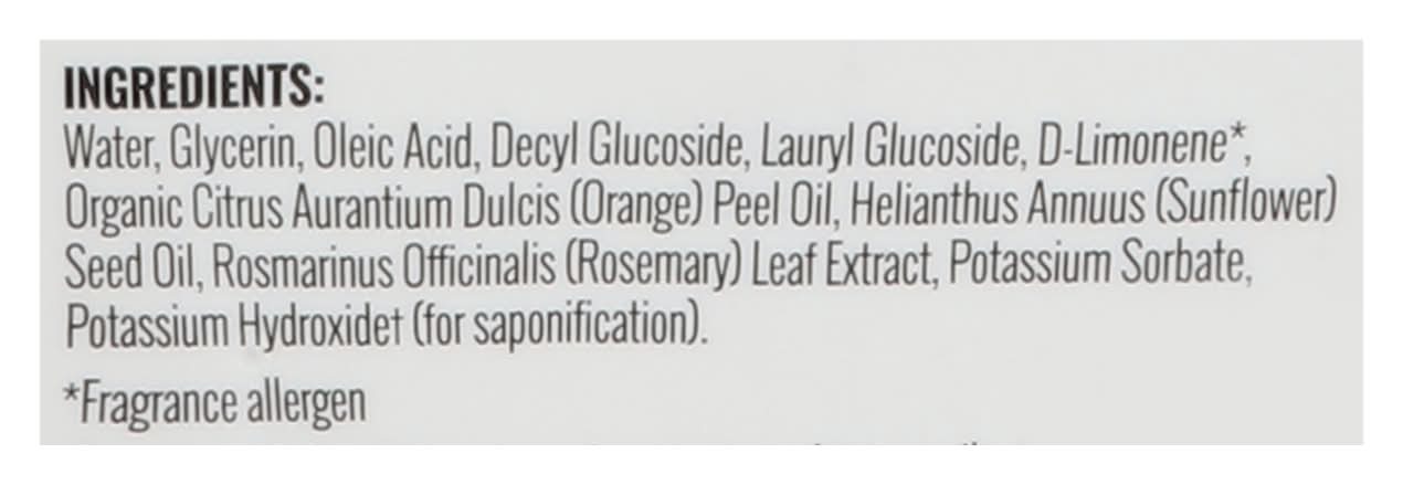 Ingredients: Water, Glycerin, Oleic Acid, Decyl Glucoside, Lauryl Glucoside, D-Limonene (Fragrance Allergen), Organic Citrus Aurantium Dulcis (Orange) Peel Oil, Helianthus Annuus (Sunflower) Seed Oil, Rosmarinus Officinalis (Rosemary) Leaf Extract, Potassium Sorbate, Potassium Hydroxide.