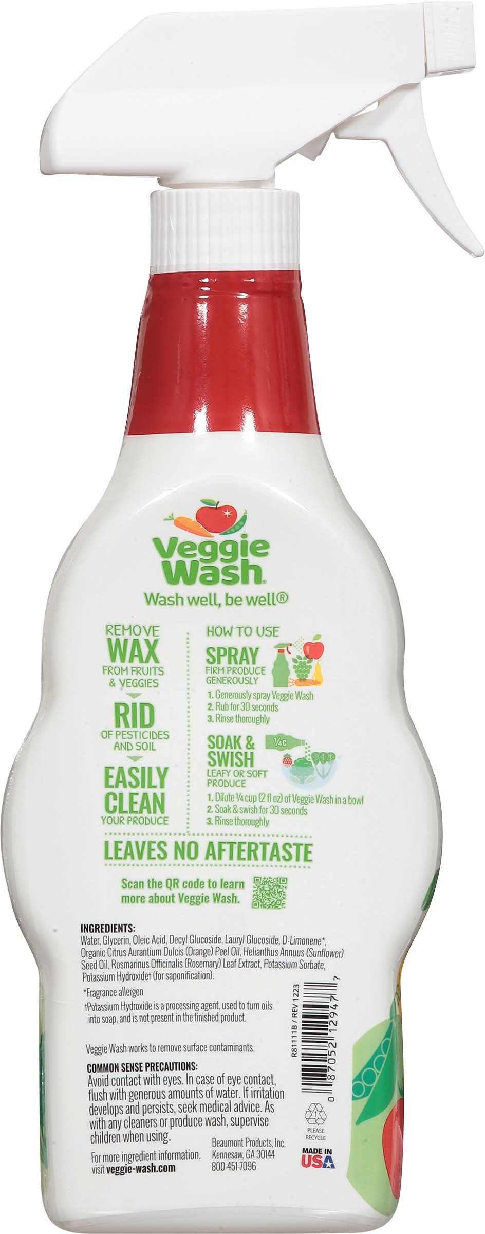 How to use: spray: firm produce generously. 1. generously spray veggie wash 2. rub for 30 seconds 3. rinse thoroughly. soak & swish: leafy or soft produce. 1. dilute 1/4 cup (2 oz) of veggie wash in a bowl 2. soak & swish for 30 seconds 3. rinse thoroughly. veggie wash works to remove surface contaminants. caution: eye irritant. common sense precautions: in case of eye contact, flush with generous amounts of water. as with any cleaners or produce wash, supervise children when using.
