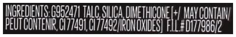 Ingredients: G952471 Talc, Silica, Dimethicone [+/May Contain CI 77491, CI 77492/Iron Oxides]