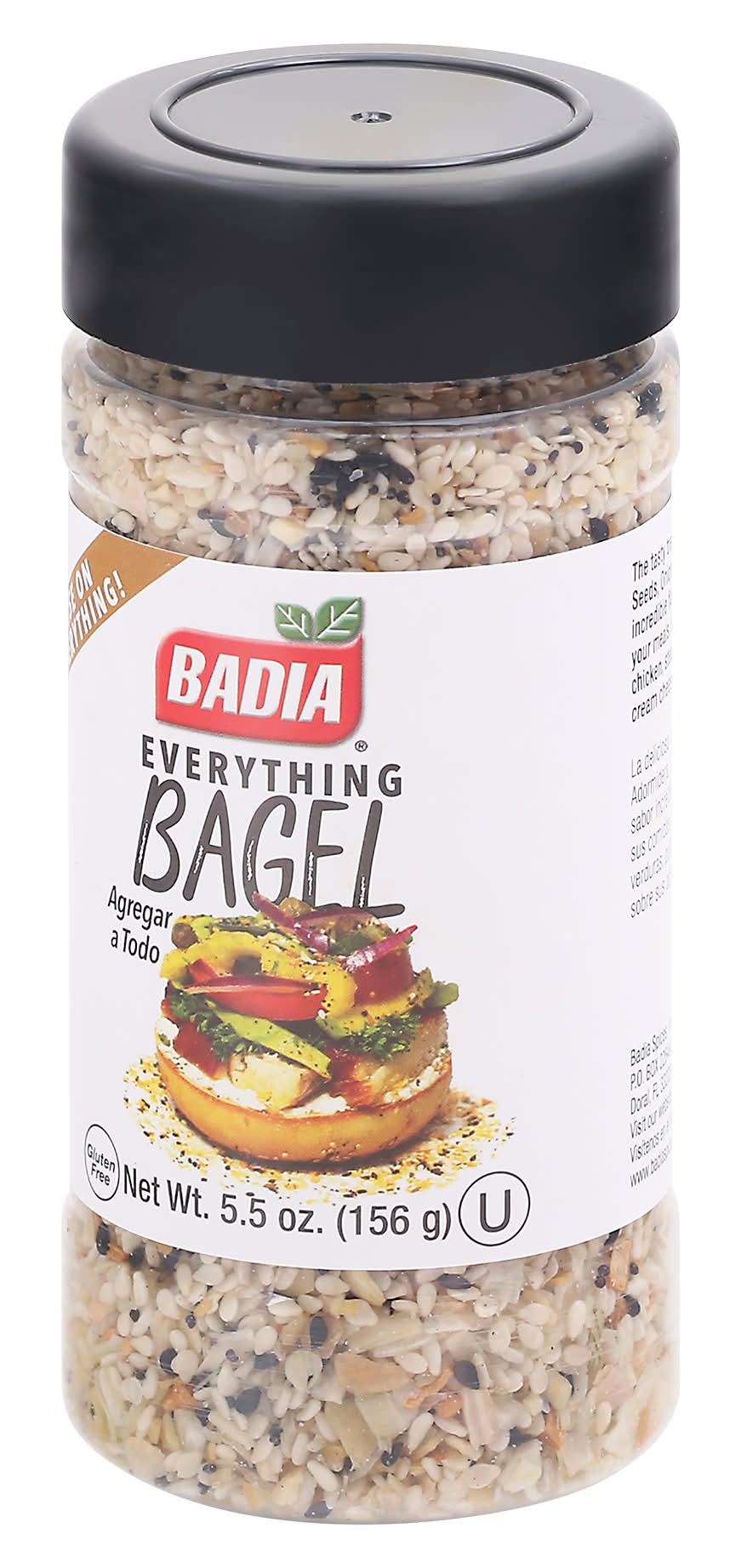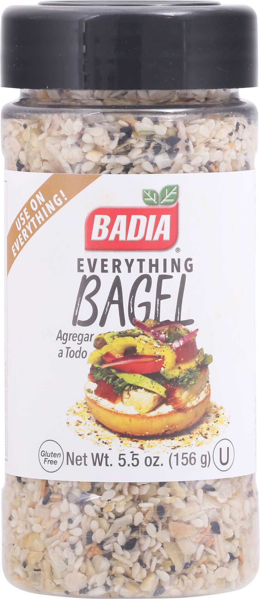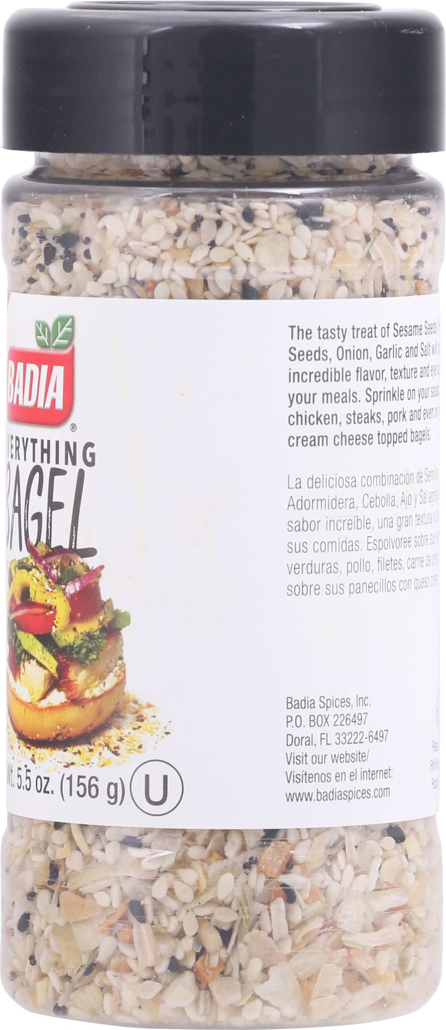 Everything Bagel • Size: 5.5 OZ • Badia Spices, Inc., P.O. Box 226497, Doral, FL, 33222-6497 • Packaging: Reusable