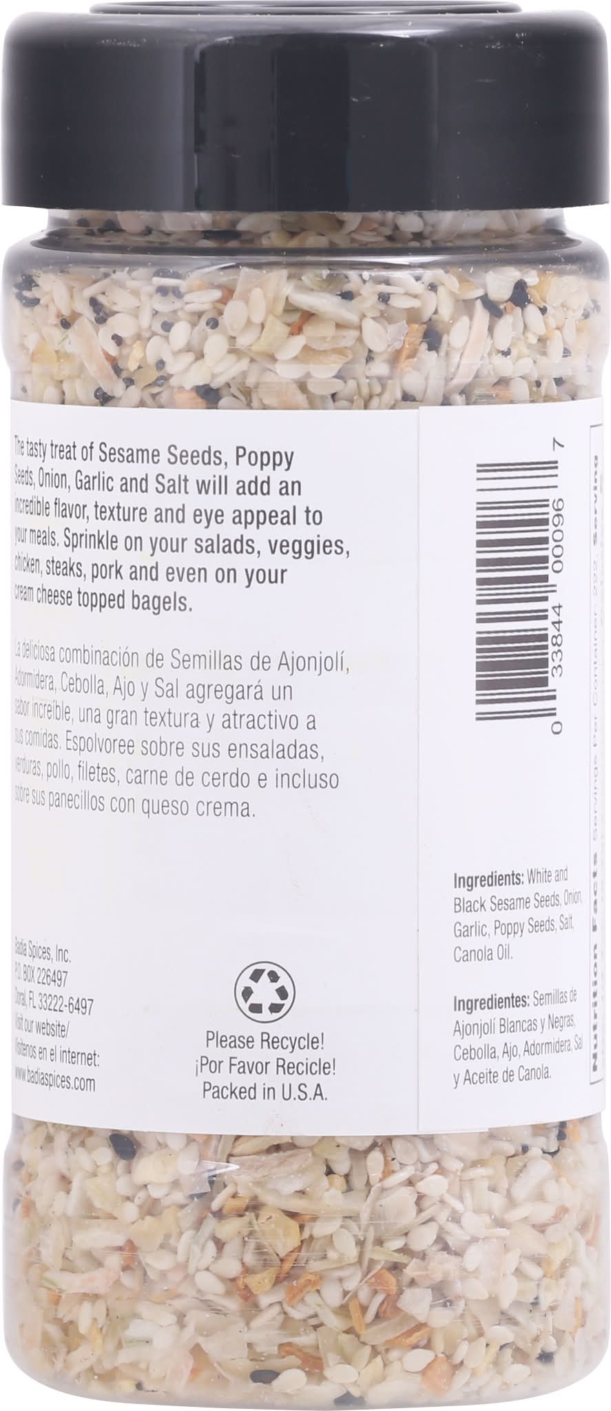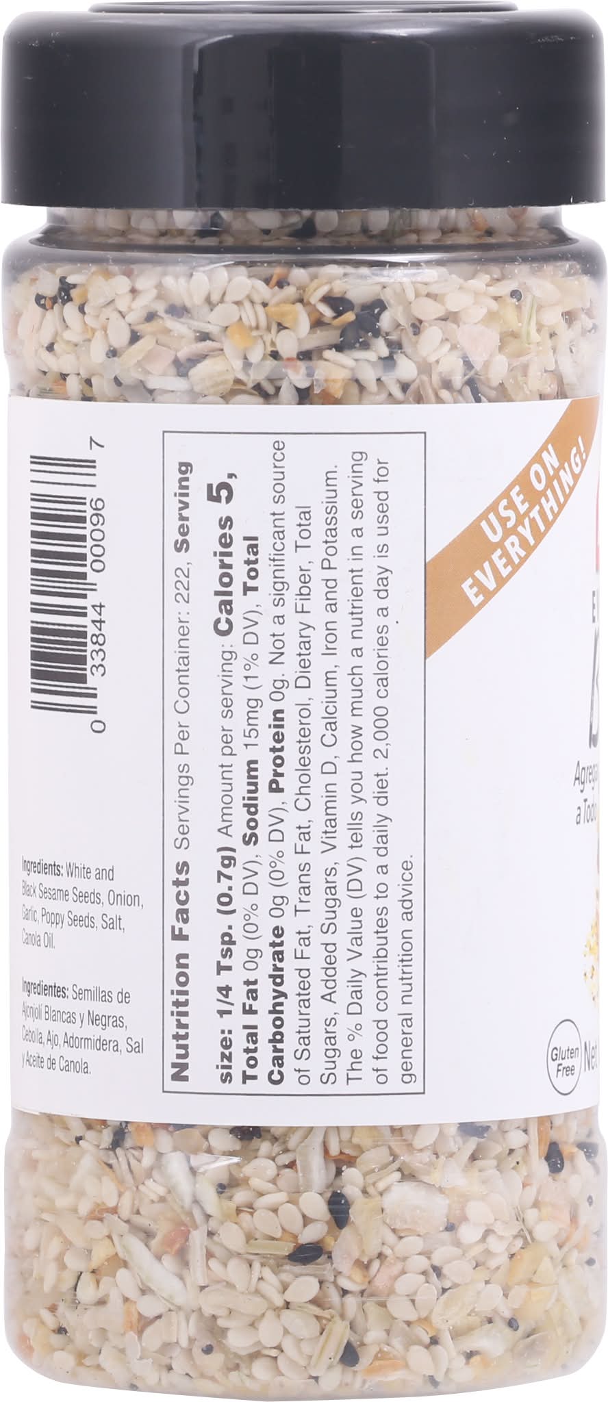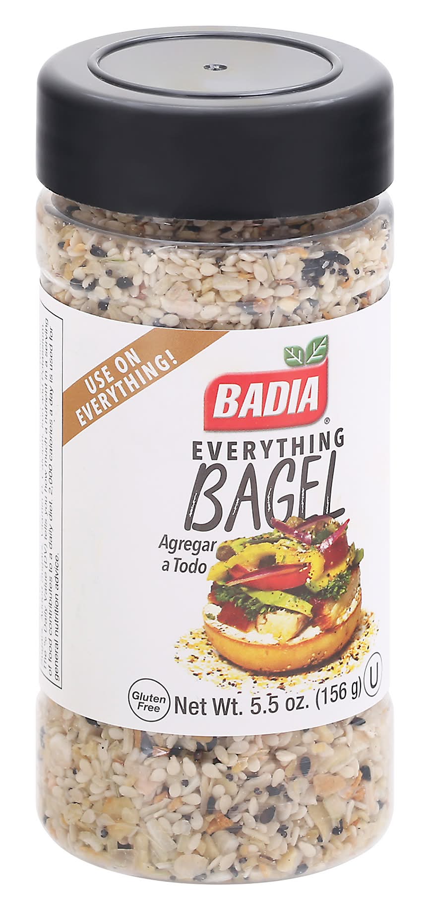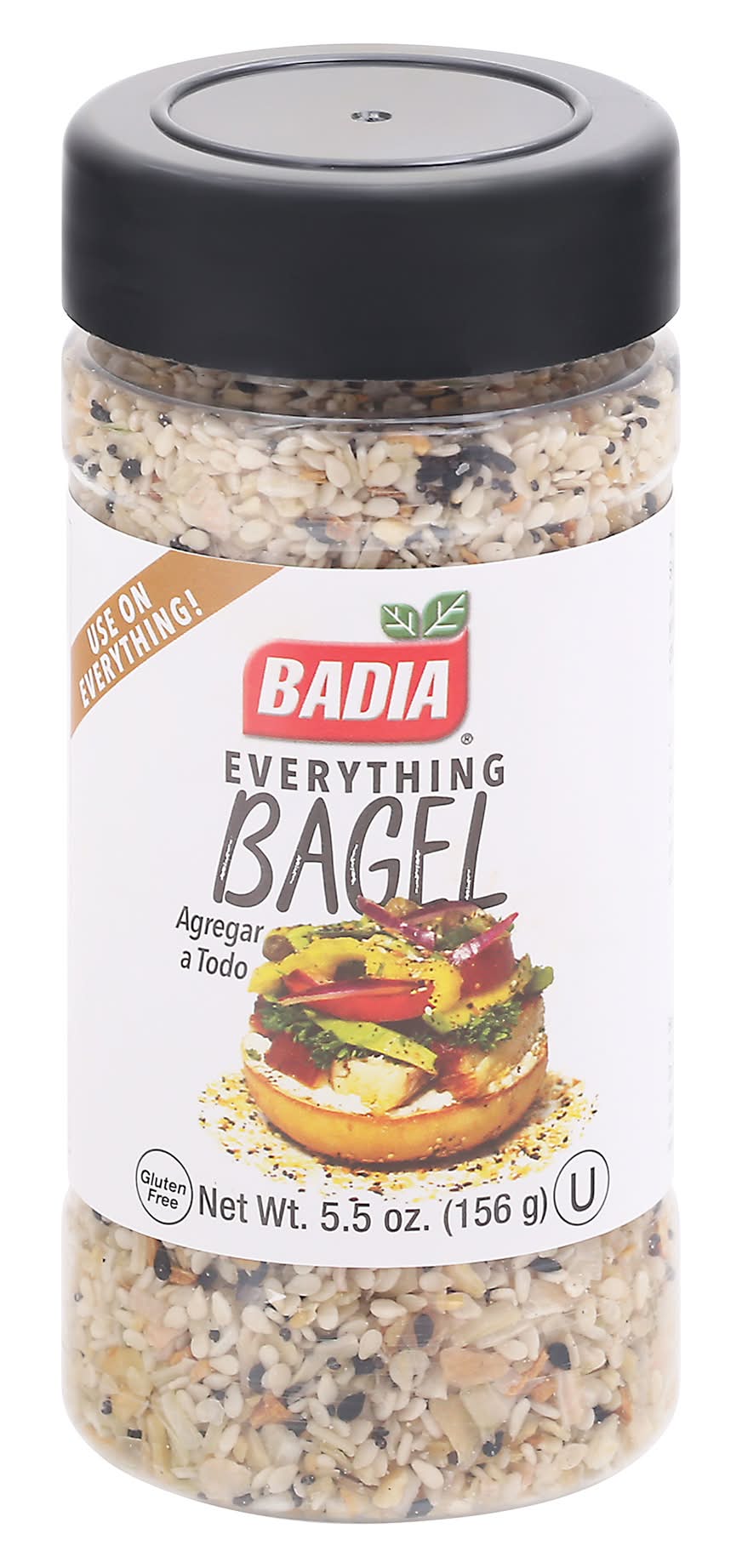 Everything Bagel • Size: 5.5 OZ • Badia Spices, Inc., P.O. Box 226497, Doral, FL, 33222-6497 • Packaging: Reusable