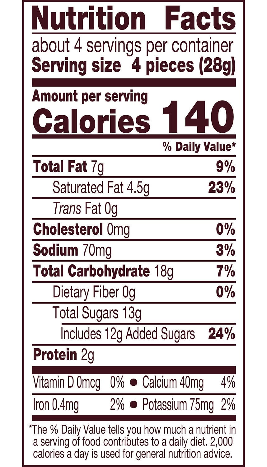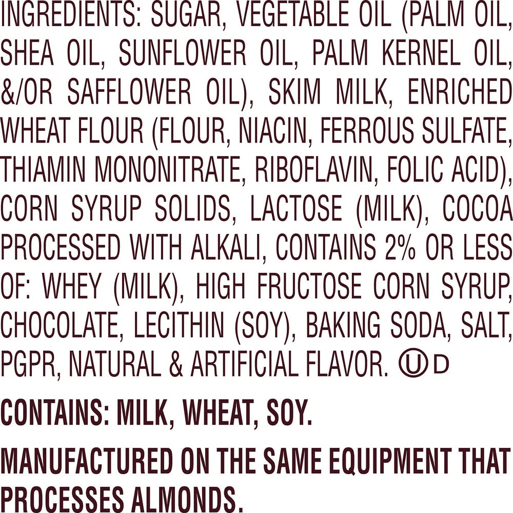 Ingredients: SUGAR, VEGETABLE OIL (PALM OIL, SHEA OIL, SUNFLOWER OIL, PALM KERNEL OIL, /OR SAFFLOWER OIL), SKIM MILK, ENRICHED WHEAT FLOUR (FLOUR, NIACIN, FERROUS SULFATE, THIAMIN MONONITRATE, RIBOFLAVIN, FOLIC ACID), CORN SYRUP SOLIDS, LACTOSE (MILK), COCOA PROCESSED WITH ALKALI, CONTAINS 2% OR LESS OF: WHEY (MILK), HIGH FRUCTOSE CORN SYRUP, CHOCOLATE, LECITHIN (SOY), BAKING SODA, SALT, PGPR, NATURAL ARTIFICIAL FLAVOR. Contains: Contains: Wheat|Soy|Milk