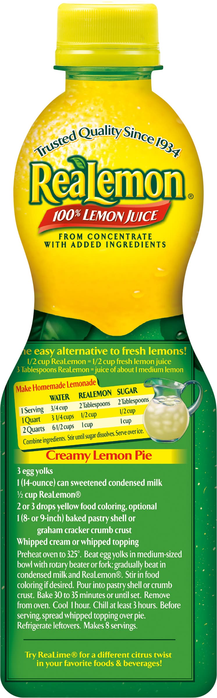 Directions for use: Shake well before using. The easy alternative to fresh lemons. 1/2 cup real lemon = 1/2 cup fresh lemon juice 3 tablespoons real lemon = juice of about 1 medium lemon. Make homemade lemonade. 1 serving: water: 3/4 cup, 2 tablespoons, Sugar : 2 tablespoons. 1 Quart: water: 3-1/4 cups, 1/2 cup, Sugar : 1/2 cup. 2 Quarts: water: 6-1/2 cup, 1 cup, Sugar : 1 cup. Combine ingredients. Stir until sugar dissolves. Serve over ice. Storage recommendation: Refrigerate after opening for best results.