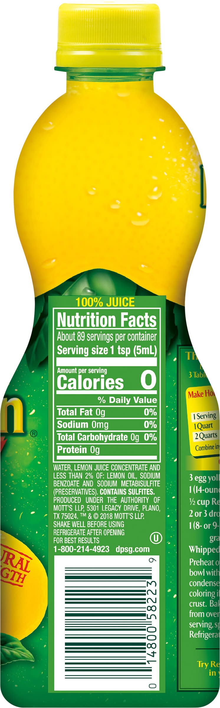 From concentrate with added ingredients. Natural strength. Trusted quality. Juice of about 10 quality lemons. Try for a different citrus twist in your favorite foods & beverages. • Flavor: Lemon • Size: 15 OZ • Mott's LLP, 5301 Legacy Drive, Plano, TX, 75024 • Packaging: Reusable