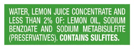 Ingredients: Water, Lemon Juice Concentrate and Less than 2% of: Lemon Oil, Sodium Benzoate and Sodium Metabisulfite Preservatives. Contains: Sulfites