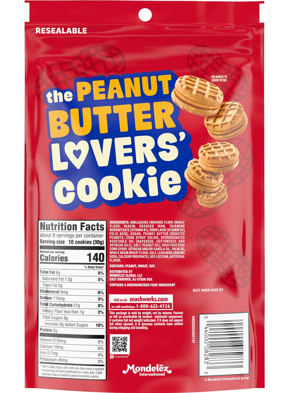 This Bites Peanut Butter Sandwich Cookies are The Peanut Butter Lovers' Cookie in a bite-sized, mini round shape. Sweet and savory peanut butter snacks, these mini cookies have a crunchy texture and a smooth, creamy filling made with real peanut butter between two crispy cookies. This Bites sandwich cookie snacks feature a peanut shell-texture design on the cookies, making snacking fun for all ages. Enjoy these certified kosher snacks on their own or try dipping them in a glass of milk. You also can use these sweet snacks as party favors, stocking stuffers, Easter basket fillers, and Halloween treats. Packaged in resealable Snak-Saks that are wonderful on the go snacks for anytime and anywhere, these snack cookies also make fantastic lunch snacks, office snacks, and road trip snacks. Size: 8 OZ