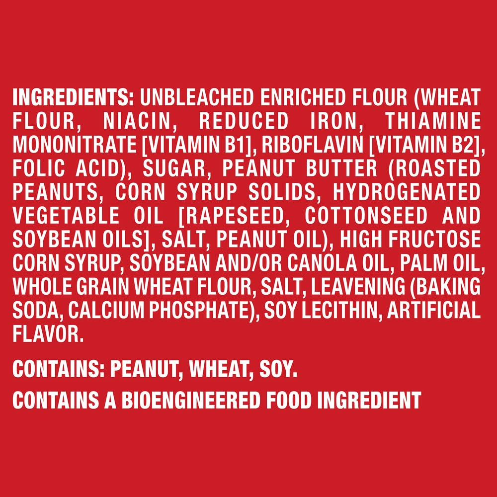 Ingredients: INGREDIENTS: UNBLEACHED ENRICHED FLOUR (WHEAT FLOUR, NIACIN, REDUCED IRON, THIAMINE MONONITRATE [VITAMIN B1], RIBOFLAVIN [VITAMIN B2], FOLIC ACID), SUGAR, PEANUT BUTTER (ROASTED PEANUTS, CORN SYRUP SOLIDS, HYDROGENATED VEGETABLE OIL [RAPESEED, COTTONSEED AND SOYBEAN OILS], SALT, PEANUT OIL), HIGH FRUCTOSE CORN SYRUP, SOYBEAN AND, OR CANOLA OIL, PALM OIL, WHOLE GRAIN WHEAT FLOUR, SALT, LEAVENING (BAKING SODA, CALCIUM PHOSPHATE), SOY LECITHIN, ARTIFICIAL FLAVOR. CONTAINS: PEANUT, WHEAT, SOY. Contains: CONTAINS: PEANUT, WHEAT, SOY. Additives: Genetically Modified Ingredients