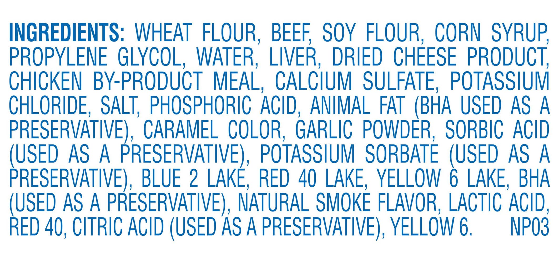 Ingredients: Wheat Flour, Beef, Soy Flour, Corn Syrup, Propylene Glycol, Water, Liver, Dried Cheese Product, Chicken By-product Meal, Calcium Sulfate, Potassium Chloride, Salt, Phosphoric Acid, Animal Fat (bha Used As A Preservative), Caramel Color, Garlic Powder, Sorbic Acid (used As A Preservative), Potassium Sorbate (used As A Preservative), Blue 2 Lake, Red 40 Lake, Yellow 6 Lake, Bha (used As A Preservative), Natural Smoke Flavor, Lactic Acid, Red 40, Citric Acid (used As A Preservative), Yellow 6 Contains: 'Wheat Contains', 'Corn Contains', 'Soybeans Contains'