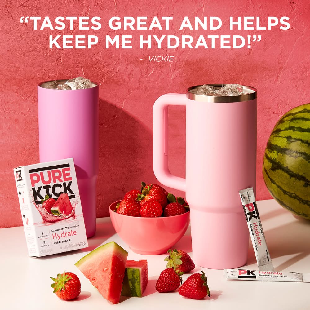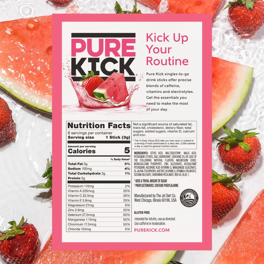 Pure Kick was made for those who love living life to its fullest. This is more than an energy drink, it's energy and hydration for fueling your passions. Pure Kick drink mix kicks up your workouts, your workdays, and any dreams you’re tirelessly working on. It comes in five bold, invigorating flavors to boost boring old water. Whether you need an energizing kick of caffeine and Vitamin B, a thirst-quenching kick of hydration, or both, this low-calorie drink mix helps you kick into high gear and stay there. Sip from a full 16.9 fl. oz. bottle of water to make room for powder. OPEN packet and POUR into bottle of water or a large glass of water. SHAKE bottle or mix well until powder dissolves. Mix with a 20.0 fl. oz. bottle of water for a milder taste. • Flavor: Strawberry-watermelon • Size: 6 CT