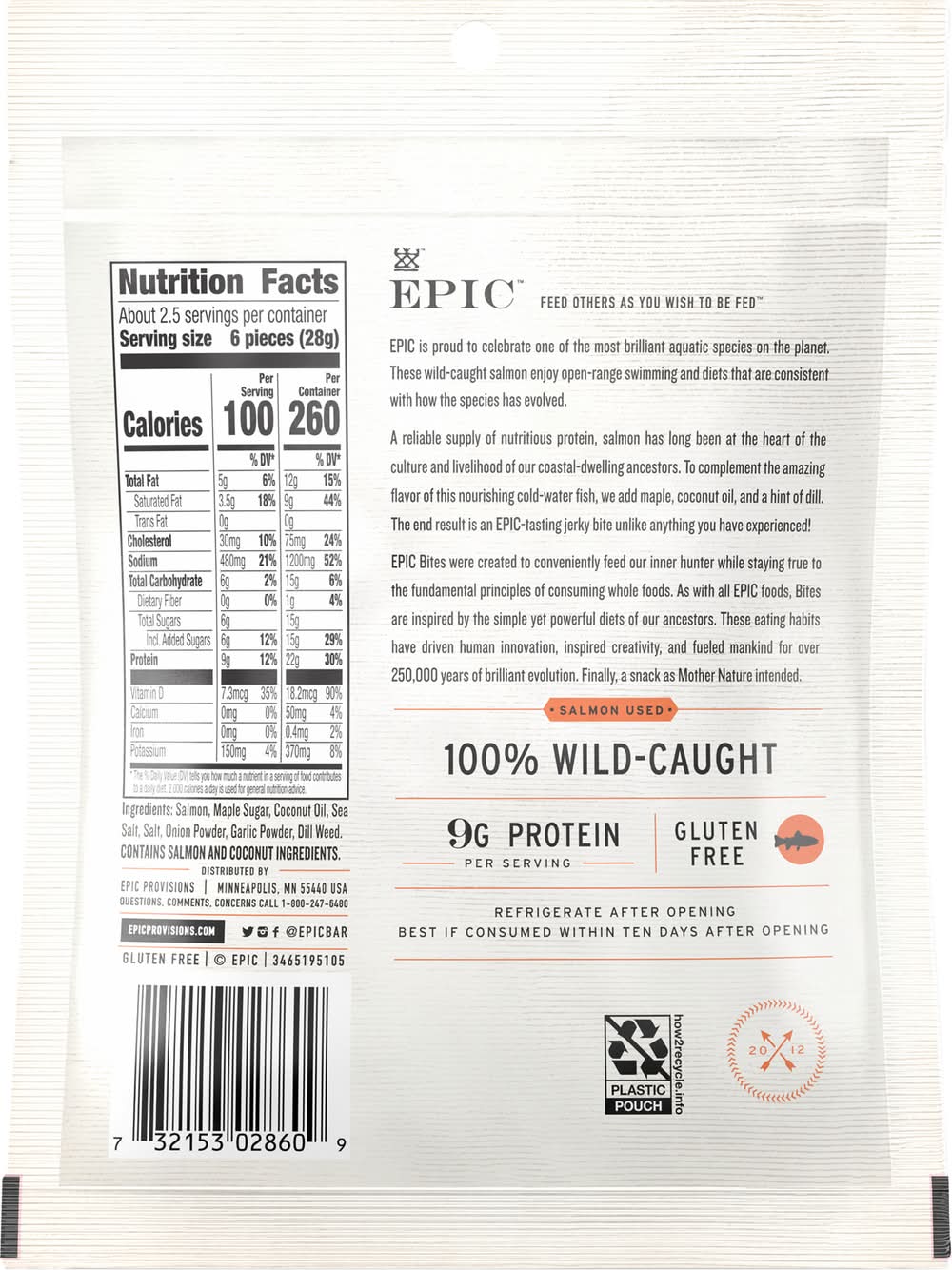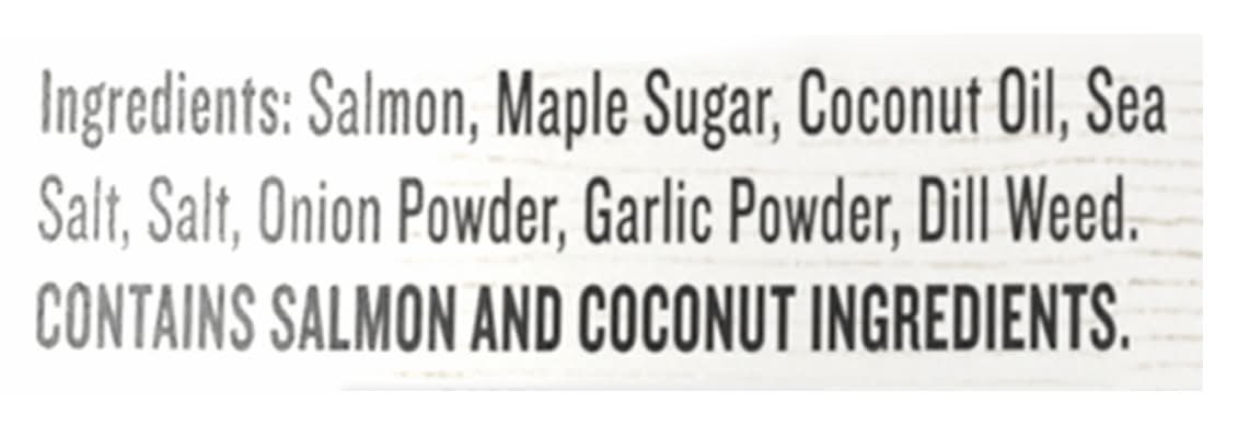 Ingredients: Salmon, Maple Sugar, Coconut Oil, Sea Salt, Salt, Onion Powder, Garlic Powder, Dill Weed Contains: Fish, Salmon, Tree Nuts, Coconuts